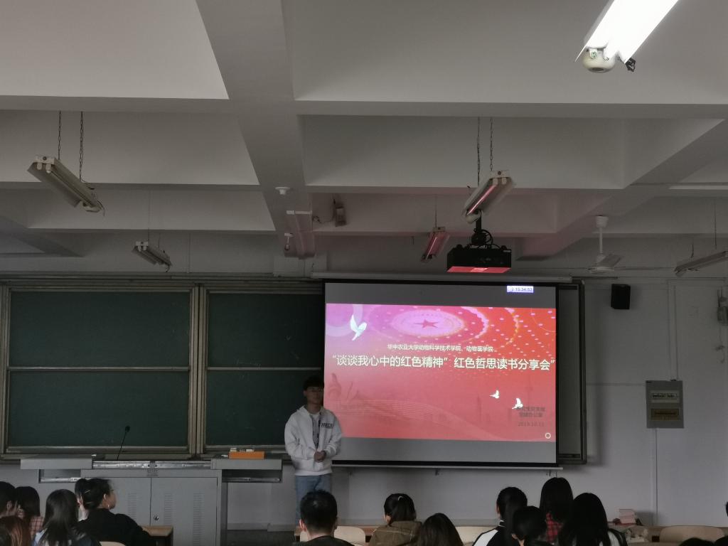 (动科动医学院通讯员 陈玉霜 杨凤鸣 供图 毛海英 杨亚萍)“我们从党史中应该传承的是我们的红色精神,不忘初心,牢记使命。而我们的初心与使命就是为中国人民谋幸福,为中华民族谋复兴......”,2019年10月11日下午14时,华中农业大学动科动医学院研究生党建办公室在第二教学楼403室主持开展了一场以“谈谈我心中的红色精神”为主题的读书分享会,分享会在研究生党建组织部部长喻正旺的主持下开展。