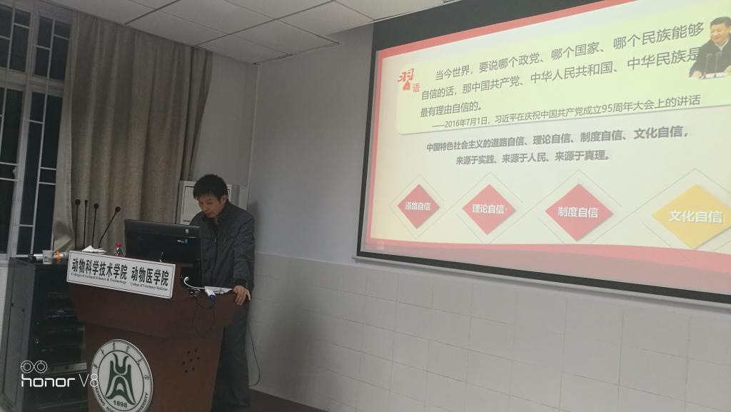 内容提要:10月16日,华中农业大学马克思主义学院陈贵华副教授做客动科动医学院,为全体研究生党支部书记、委员带来了一堂生动的党课——“当代中国发展进步的根本方向—关于新时代坚持和发展中国特色社会主义”。方向决定道路,道路决定命运,陈老师生动地为在场的党员们阐释了:为什么方向永远比努力更加重要。