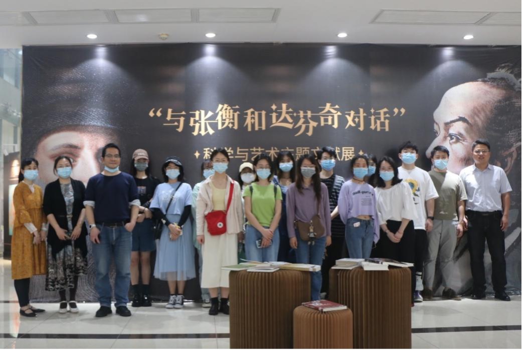 学院师生前往学校图书馆参观“与张衡和达·芬奇对话”科学与艺术主题文献展,该主题文献展是由2022狮山读书节组委会和张衡博物馆合作策展、设计、筹备、布展的,展览运用原著展示、文献复刻、空间设计等方式,以图书展览、文献摘录、模型实物、艺术装置等媒介为参观者提供深度广义的沉浸式阅读体验。