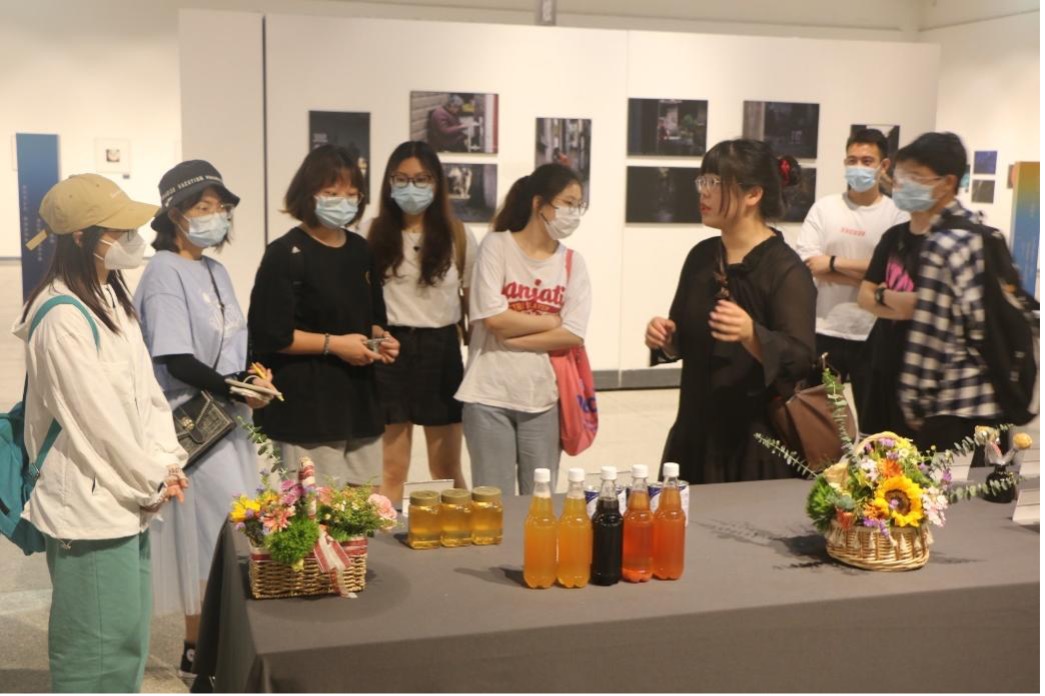 学子将知识谱写在祖国大地上的生动写照。而“陟遐”部分向我们展示了一幅幅社会主义新农村的纪实画卷:有朴实老党员视若珍宝的的荣誉证书,也有身残志坚的夫妻迎难而上、奋力脱贫,每一幅摄影作品背后都是一个动人故事,彰显出普通人在平凡生活中不平凡的坚守,同时也激励着观展的莘莘学子们勤读力耕、踔厉奋发。在“彰思”部分,实物展品吸引了不少观展者的注意:动科动医学院的动物疫苗、水牛奶、野桂花蜜,食品科学技术学院的创意食品,水产学院的微型造景,园艺林学学院的微景观设计都颇具学院学科特色。