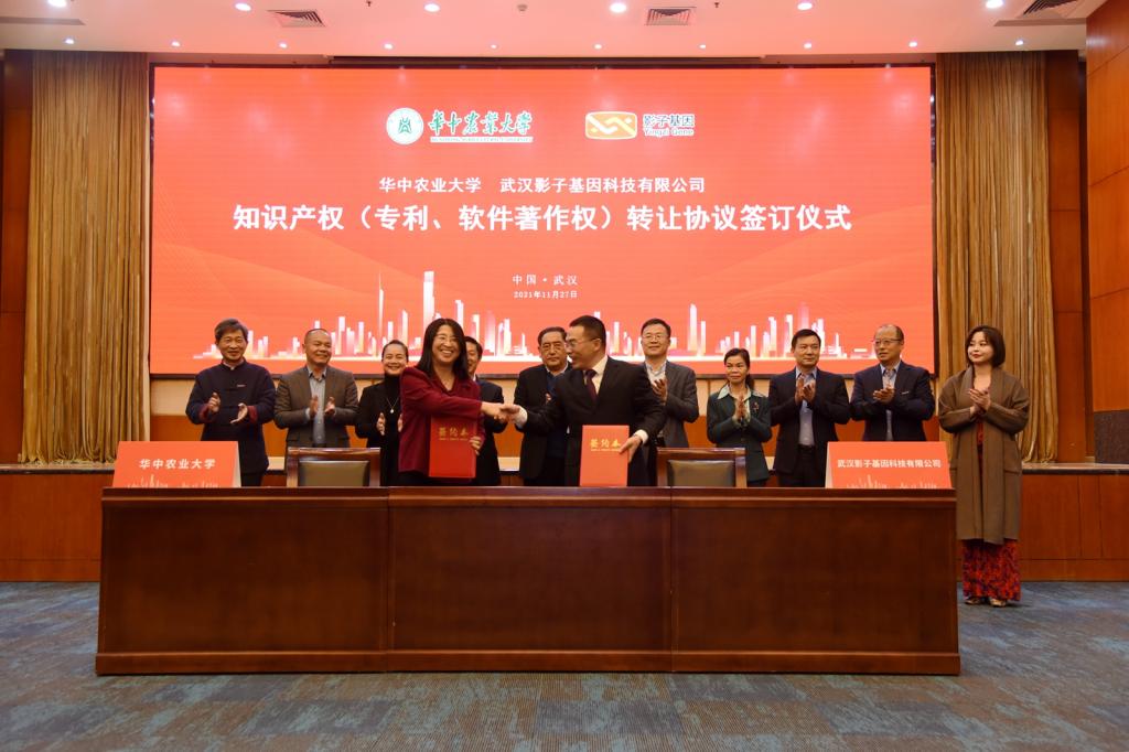 动科动医学院院长赵书红与武汉影子基因科技有限公司董事长李育林共同签订了华中农业大学、武汉影子基因科技有限公司知识产权(专利、软件著作权)转让协议。