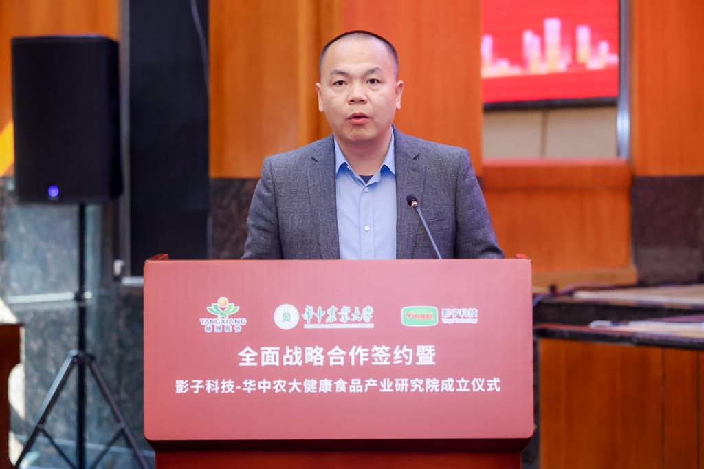 施亮在致辞中表示,再次回到母校感到非常亲切。他回顾了华农和扬翔10余年的合作历程和所取得的成果,他说:“昨日辉煌,皆为序章,凡是未来,皆有可期。作为一名曾经的华农学子,如今的扬翔人,我倍感骄傲。”就未来双方合作,他提出“产学研融合既是产业链、教育链、人才链有机衔接的发展方向,也是让科研成果不断契合产业发展的有力抓手”,今后要加快数字化发展,协同推进数字产业化和产业数字化转型,积极响应国家号召、强化协同创新、整合优势资源、主动服务国家乡村振兴战略的重大举措,为实现“健康、安全、美味、便利”使命而共同努力。施亮表示,影子科技-华中农大健康食品产业研究院将开展深入研究,有力推动技术创新、产业创新、应用创新,为中国食品安全做出新的更大的贡献。