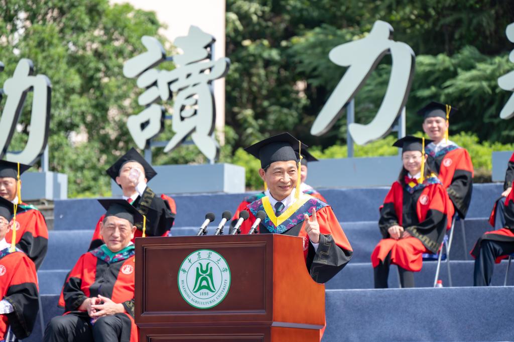 校长李召虎以“勇敢走在时代前列”为题发表讲话,他认为,新时代华农学子应做到三点。第一,做一名爱国的“忠诚者”,厚植家国情怀,点亮信念之光;第二,做一名担当的“奉献者”,厚植无私品格,成就人生价值;第三,做一名奋斗的“先锋者”,厚植拼搏精神,走在时代前列。在讲话最后,他叮嘱毕业生们,要牢记华农“勤读力耕,立己达人”校训,坚守华农人“不张扬、不浮躁、不盲从”品格,祝福毕业生们如虎添翼、展翅高飞。