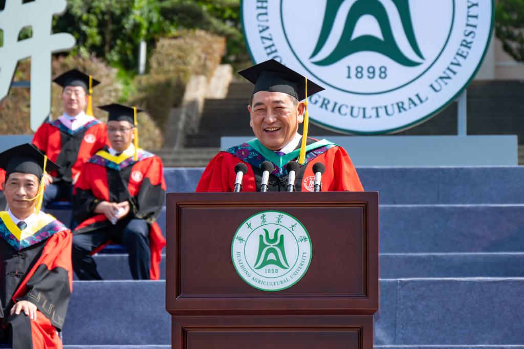 学位授予仪式礼成后,陈焕春院士发表讲话,他强调,未来国家的发展需要依靠“人才立国”、“科技强国”、“产业兴国”,同时,他发出“成为民族脊梁,服务全人类并最终服务自己”的美好愿景,与大家共勉。