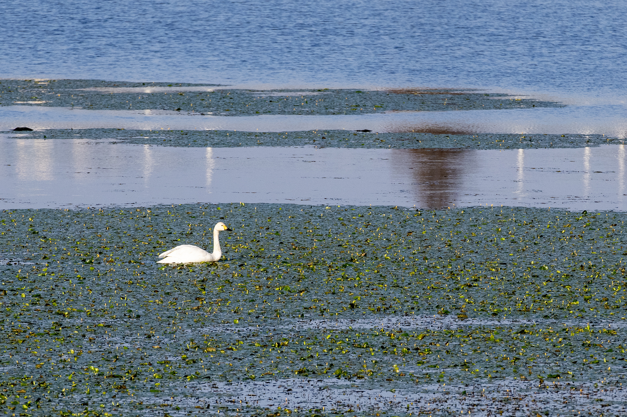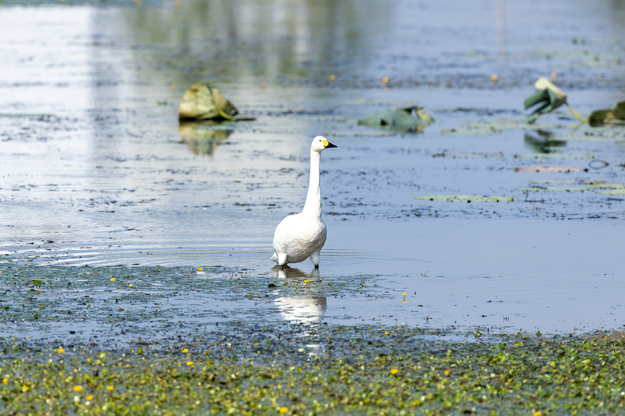 观鸟爱好者在校园南部野芷湖畔意外观测到一只珍贵的“客人”——小天鹅。远远望去,这只小天鹅与同在野芷湖越冬的白鹭、鹬、小鷿鷈、黑水鸡等鸟类相比,体型较大,颇为显眼。它羽毛洁白脖颈长长,有着黑色的脚和蹼,时而安静地在野芷湖水面游弋觅食,时而姿态优雅地步上岸边浅滩晒太阳。
