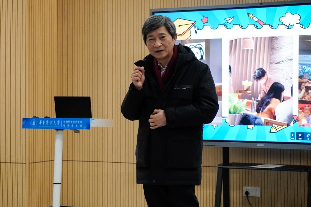 在四综D201活动室,高翅表示,“同学们提到大学,那么什么叫大学呢。我理解的大学是‘立大志’‘成大事’。学是学问、问学。大学不做学问,‘学’就没有意义了。”他说,“大学是常新的,大学校园因青年学生而富有朝气,老师因学生而青春焕发,希望同学们在大学里‘明大德’‘立大志’‘成大业’,践行三全育人、五育融通、师生融乐、全面发展育人理念,行而不辍、创新不止,用奋斗的青春去找寻求真、崇善、尚美的意义世界。”借助校歌中“宏农学、扬国光、日新永无疆”的歌词,他强调,“‘日新’指的是每天都要有进步,每天都要有创新,唯有如此,我们才能实现农业的进步乃至人类科技的进步。”他引用《大学》中“大学之道,在亲民,在止于至善”为同学们指明前进的方向。