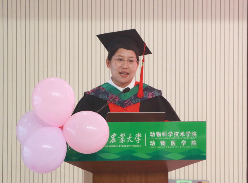毕业研究生代表2019级动物遗传育种与繁殖专业博士研究生唐振双同学发表毕业感言。在发言中,她分享了自己在实验室学习和成长的心路历程,并对导师和同学们表达感谢之情。随后,主持人邀请毕业生向在场的导师送上手写的祝福卡片,并合影留念。