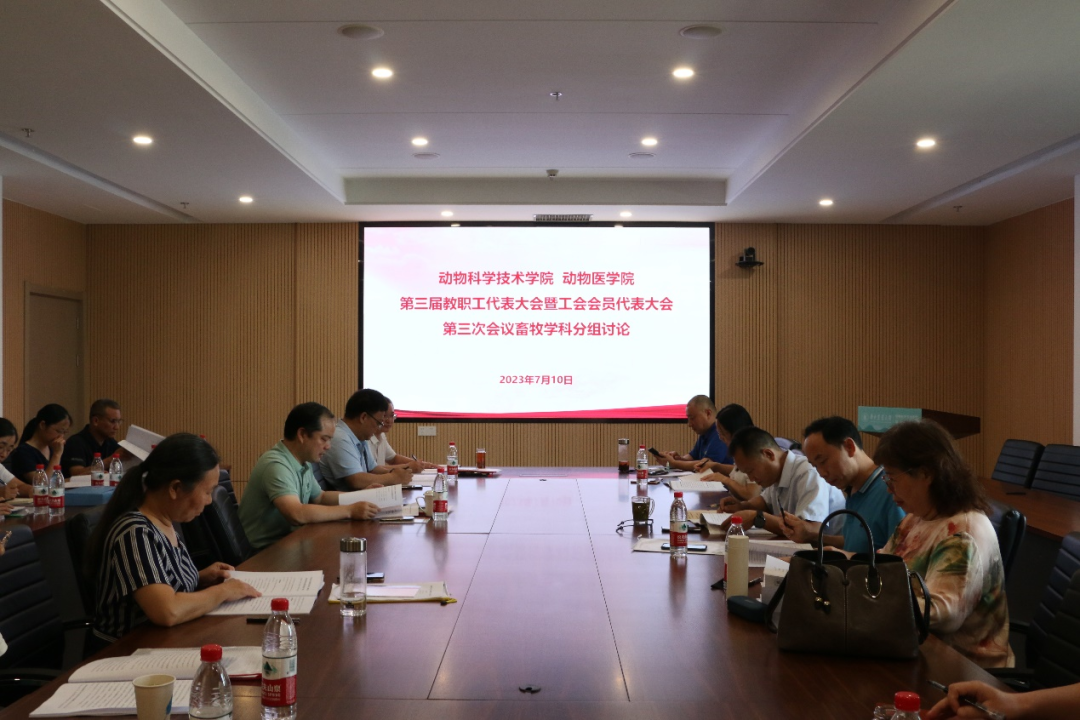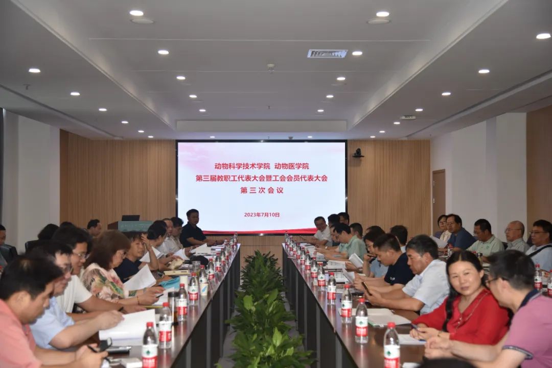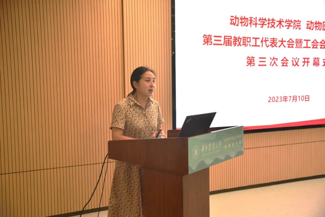 (通讯员:邓易安 陈玉 雷欣雨 汪楚琪)7月10日下午,动科动医学院第三届教职工代表大会暨工会会员代表大会第三次会议(以下简称“三届三次‘双代会’”)在第四综合楼召开。学校工会常务副主席余顺华应邀出席会议并讲话。会议听取了学院院长赵书红教授关于生物育种产教融合创新平台建设的专题报告,审议了学院工作报告、学院财务工作报告和学院工会工作报告等的书面文本,分畜牧、兽医两个学科组讨论相关报告与制度文件。畜牧学科组徐学文教授、兽医学科组黄琦副教授分别进行了大会交流发言。大会由学院副院长、工会主席李家奎教授主持。