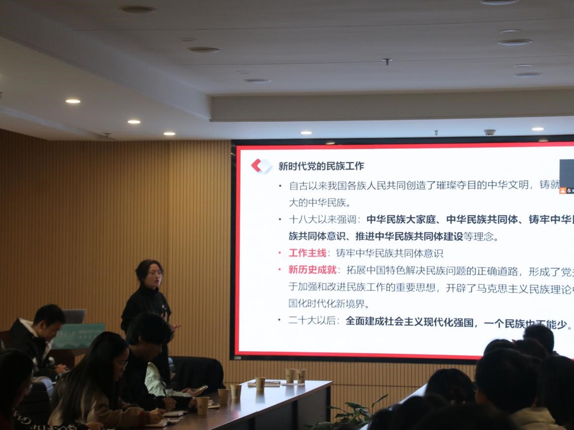 徐艳介绍“三联”理论创新实践基地建设。她谈到,要充分发挥洪山区“大学之城”高校云集的区位优势,进一步创新华农西社区高校区域化党建联建,推动校舍公寓工作高质量发展,努力创新党的理论宣传工作的方式,加强理论与实践的对接,共建社区与高校院系“联学、联言、联动”的理论创新实践基地。她还展示了社区开展“三联”活动以来取得的诸多成就,并希望在今后能够进一步加强社区与各学院党支部间的合作,共同进步。
