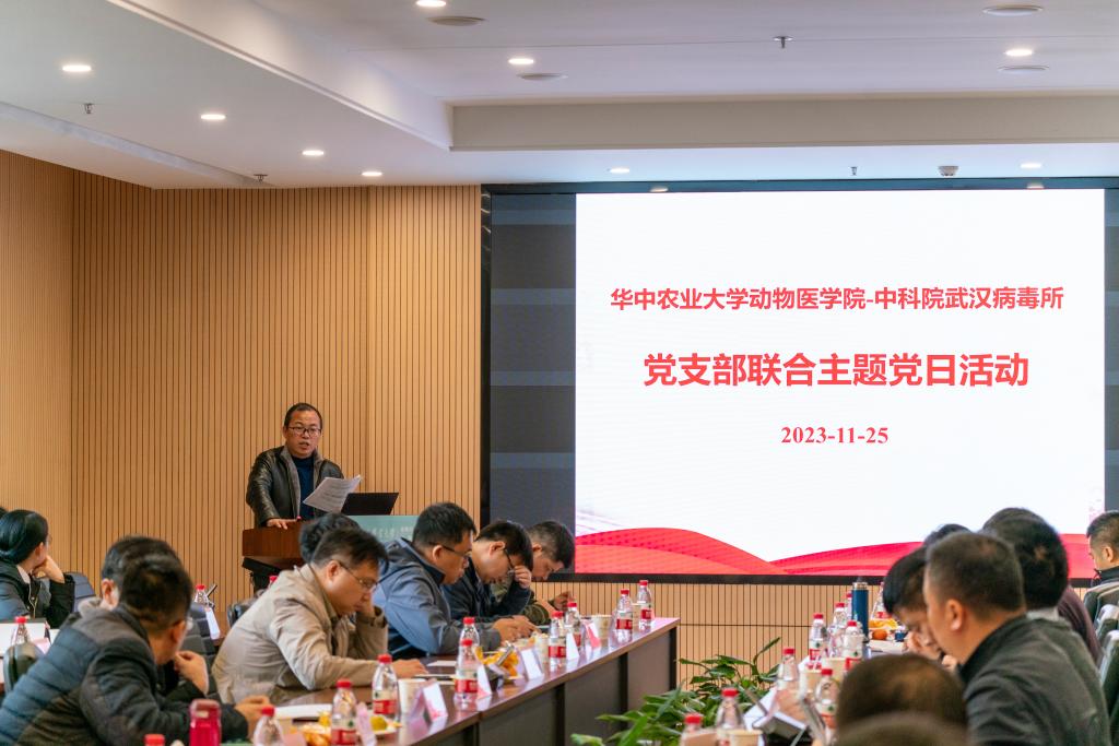 (通讯员:王玲力、王衍霖)11月25日,华中农业大学动物医学院公共卫生学系、预防兽医学系教工党支部、研究生党支部与中国科学院武汉病毒研究所党支部在第四综合楼D207会议室联合举办了主题党日活动。动物科学技术学院/动物医学院副院长李家奎教授、国际合作与交流部(港澳台事务办公室)副部长申邦教授、中科院武汉病毒研究所副所长龚鹏研究员等出席了本次活动。此次活动旨在通过党建工作推动科研事业发展,是党建与科研相结合的有益探索和实践。