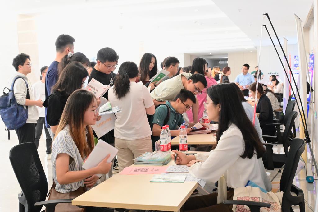 招聘会现场人流涌动、气氛热烈,各企业展位前人头攒动,毕业生们手持简历,积极主动与招聘工作人员沟通交流,仔细了解各个岗位要求、福利待遇、公司文化、职位晋升政策等信息,并交换联系方式。