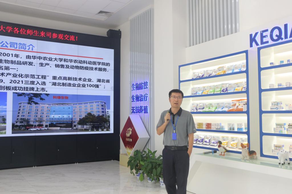 武汉科前生物股份有限公司猪用病毒疫苗研发主管张华伟对同学们的到来表示欢迎,他介绍到:陈焕春院士提出的“三创”精神(创新、创造、创业)不仅是华中农业大学动科动医学院人才培养秉承的教育理念,也是对科前生物创办过程和发展历程的精准概括:先有科技创新,后有产品创造,然后面向市场创业。在“三创”精神的引领下,科前生物的生产经营不仅面向传染病领域的重大科技问题,还肩负着国家重大专项科研项目的重任,同时不断创造出新的动物疫病疫苗产品,产品能够解决产业发展面临的严峻问题,企业得以发展壮大。