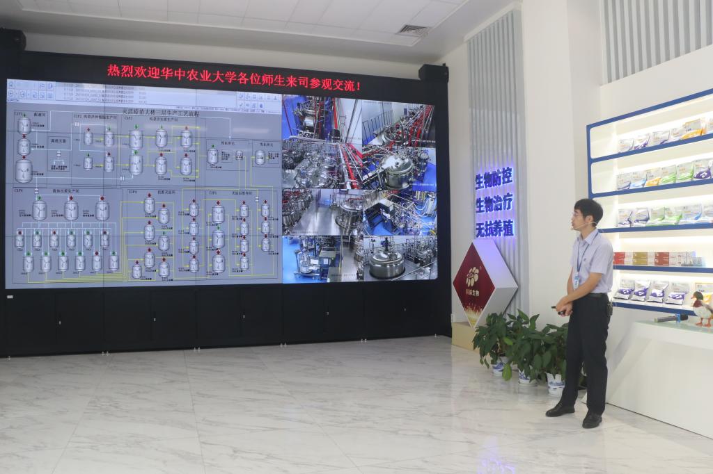 武汉科前生物股份有限公司人力资源部负责人韩伟对公司情况就公司简介、创新团队与平台、科技成果和创新方向、市场推广与技术服务、理念与使命及科前梦六大方面进行介绍。他提到,陈焕春院士还提出了“三国”——人才立国、科技强国、产业兴国与“三做”——做好人品、做好产品、做好信誉等理念,深刻地指导了公司发展。通过观看车间监控,同学们对兽用疫苗的生产流程及设备工艺进行初步了解。