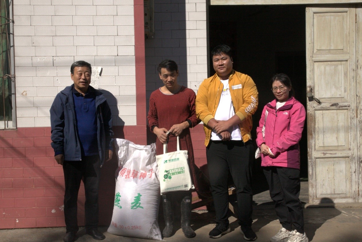 (科技特派团肉牛产业组专家为养殖户分发牧草种子及兽药)