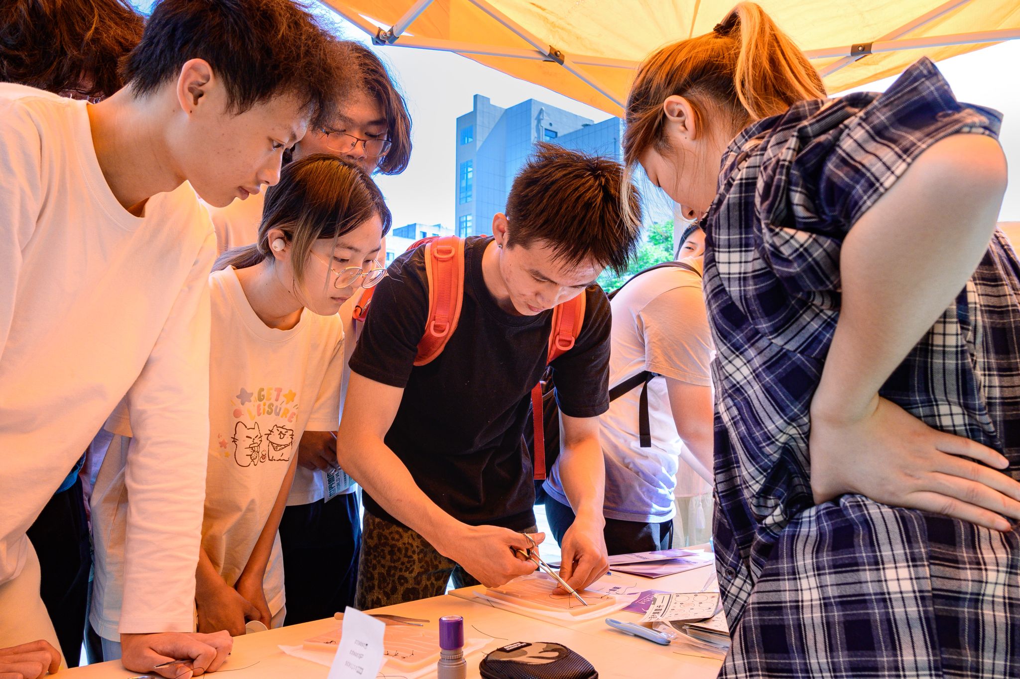 与此同时,其他技能体验活动有条不紊地进行着。骨骼拼装区,参与者们围聚一起,共同将每一块骨骼归位。动医2206班姚锐敏分享道:“我尝试了多次,最后在工作人员的帮助下才成功拼装,收获真的很大。”单手打结挑战区,众人积极学习单手打结技巧,踊跃挑战;缝合静脉注射体验现场,同学们手持工具,神情专注地反复练习操作手法;健康养宠知识问答环节,参与者抽取题目卡片,在答题过程中掌握宠物养护知识;宠物急救模拟演练中,工作人员规范演示宠物心肺复苏方法,并强调操作要点:“过程中一秒按压两次,三十次通两次气。”活动现场气氛热烈,参与者们在实践与互动中感受兽医专业技能的魅力。