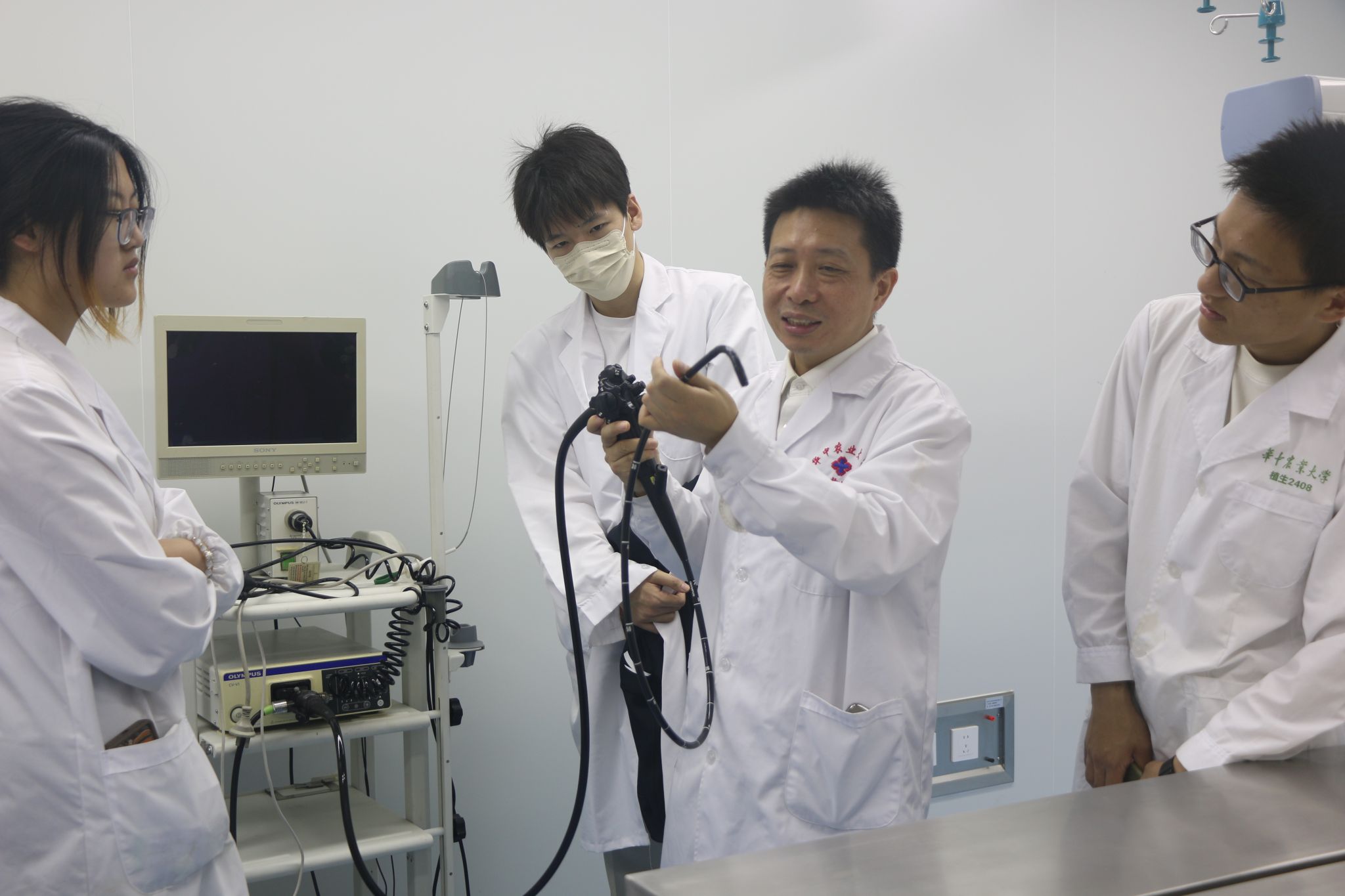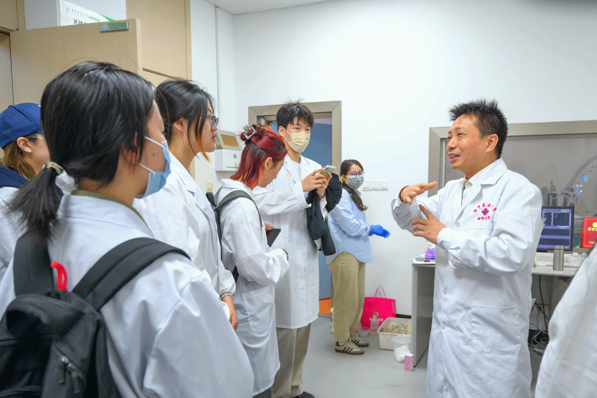胡长敏和詹存林医生在病理处理室演示了病理样本的观察,并对积极提问的同学们进行回应。