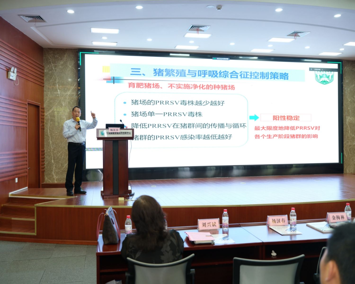 陈焕春谈到,近年来,猪病越来越复杂,病毒变异速度远超预期,重组毒株频现,防控形势严峻,提高临床兽医水平是预防和消灭疫病的关键。他提出,一要加强疫病流行病学与病原学研究,为疫苗、诊断制剂等产品研发提供精准靶点;二要研发安全高效、物美价廉的防控产品,让养殖户用得起、用得放心;三要加强科技创新、产品创新、服务创新,结合检测技术为猪场提供“体检式”解决方案。陈焕春强调,唯有通过科技赋能,构建全链条防控体系,才能真正实现重要疫病的净化根除,切实减少疫病对生猪产业造成的重大损失和危害。
