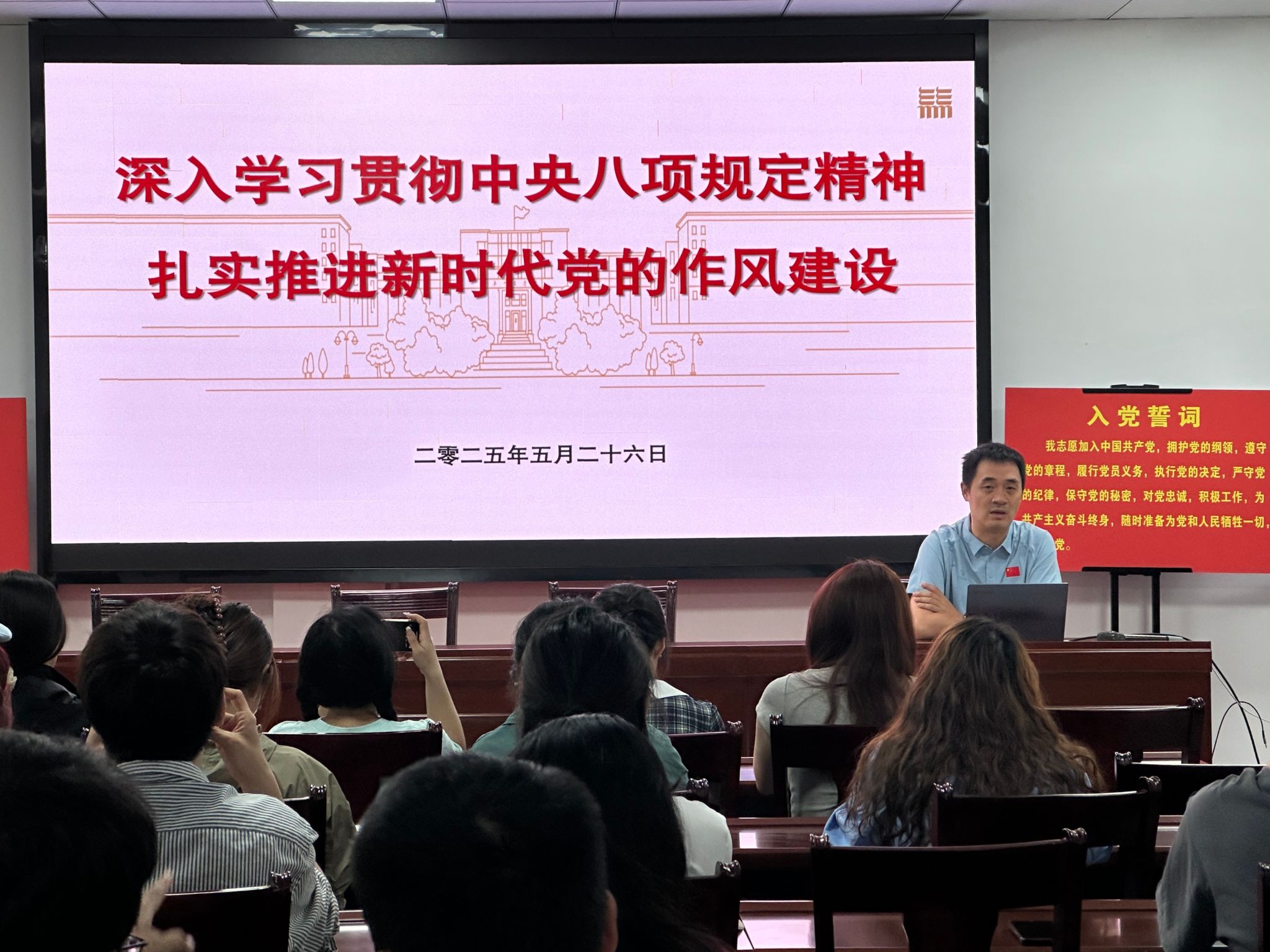 5月25日上午,学院党委副书记杨冬凯围绕深入学习贯彻落实中央八项规定精神讲授了专题党课。他结合学习工作实际,对中央八项规定及其实施细则进行深入解读,阐述学习教育在实际工作中的运用。他表示,作为师生党支部书记,同志们必须以更高的政治站位推进作风建设,将中央八项规定精神融入支部日常建设;提高思想意识,以深入贯彻落实中央八项规定精神学习教育为指引,扎实推进新时代党的作风建设。