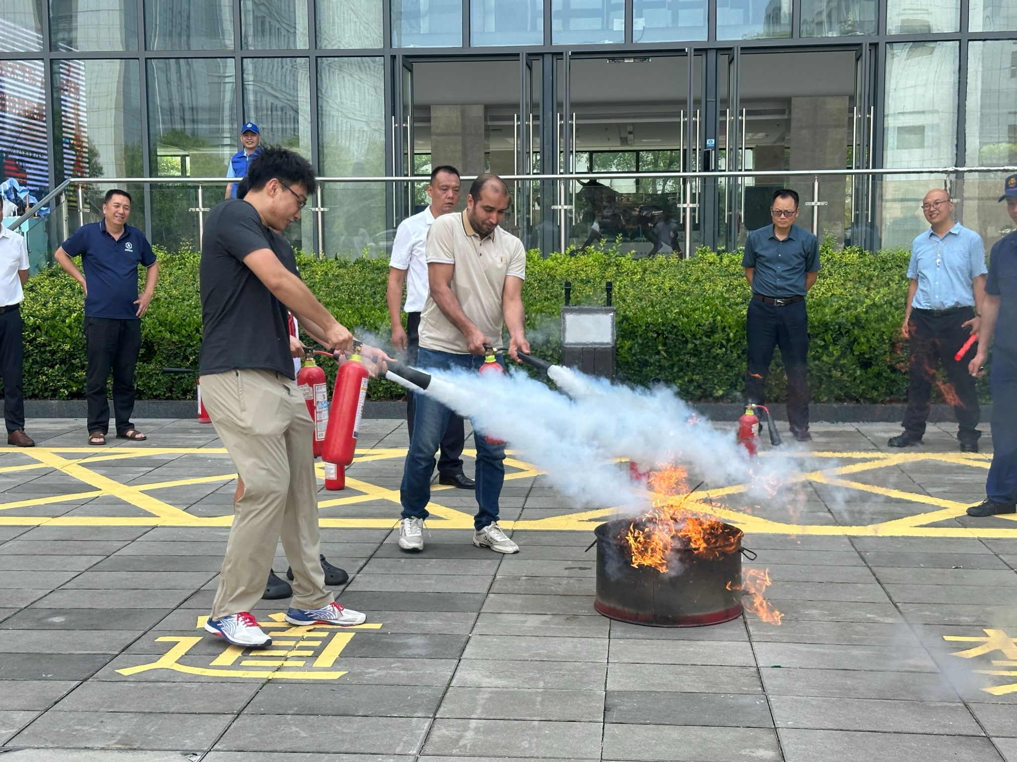 留学生参与灭火器实操培训(记者 汪启航 段雯潇 摄)
