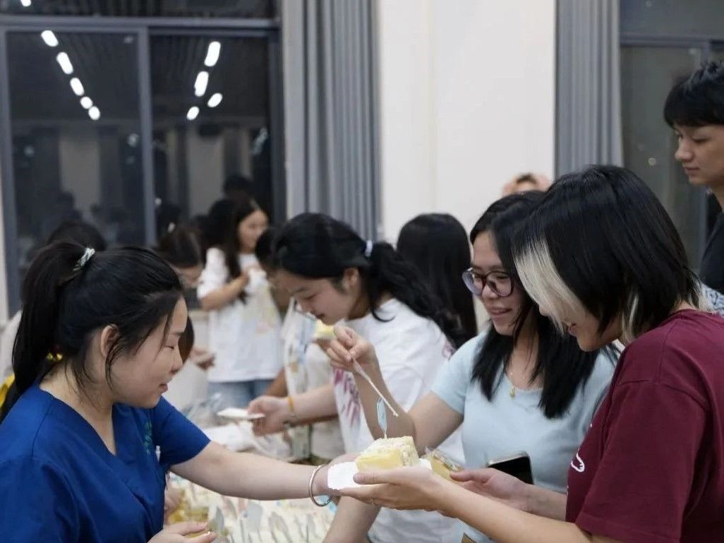 盛会落帷,合影时刻,定格今晚美好!胡长敏院长带领大家移步报告厅讲台中央拍照留念,分享写有全体实习生和老师姓名的蛋糕,传递今晚的美好,以庆祝这段难忘的旅程。带着今晚的收获与感动,华中农业大学动物医院2025教学实习总结暨表彰大会圆满结束!