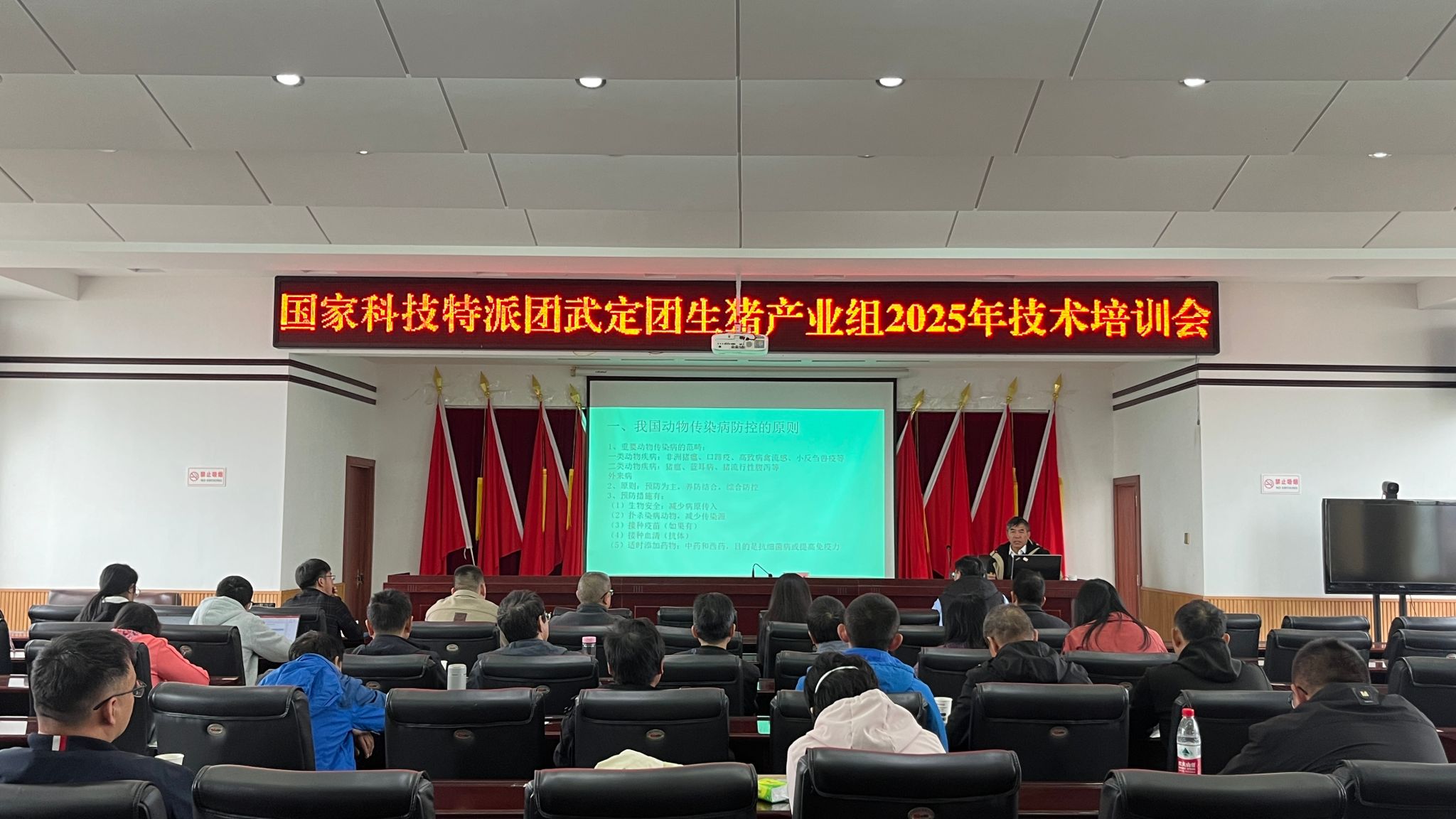 次日(10月24日),特派团在武定县举办了专题技术培训。何启盖教授围绕“动物传染病免疫预防”与“猪场健康管理”两大主题,为当地养殖场技术人员进行了系统讲解。讲座结合最新科研成果与实践案例,深入阐述了疫病防控策略与猪场管理要点,解答了从业人员在实际操作中遇到的技术难题。