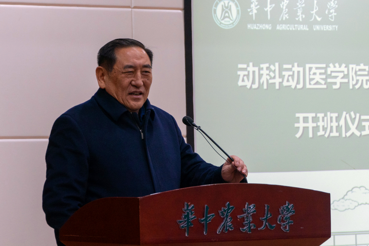 高翅在讲话中表示,一代人有一代人的使命与担当,一代人有一代人的奋斗与奉献,当前我国畜牧兽医行业与世界先进水平相比仍有一定差距,需要同学们清醒认识、努力学习,在未来承担起重要使命,打好翻身仗,实现科技的自立自强。他强调,专业学位硕士人才培养改革班的同学们应当明确认识、提高站位,从人类健康安全的宏观角度重新构建职业定位和个人认知。随着人类社会高速发展,破坏自然生态无形中加剧了人畜共患病的发生,一方面威胁到以肉蛋奶为代表的食物安全,另一方面直接威胁到人类健康,因此保障动物健康,促进人与自然和谐共生俨然成为守护人类生命健康安全的重中之重,高级临床兽医人才班、生态与智慧养殖人才班的开设对守护人类生命健康安全大有裨益,也为不确定的未来做好了充分准备。他以董必武先生题词“民生在勤,勤则不匮;性习于俭,俭以养廉”与师生共勉,勉励人才培养改革班同学们志存高远、勤奋学习,以过硬政治素养和扎实知识技能迎接新时代的挑战。
