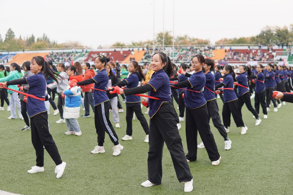 传统保留项目,而彩绳弹力操则是体育部教师为本届运动会特别编排的健身操。120名身着蓝色院服的动科动医21级新生动作整齐划一,摆臂、跑跳、旋转,每一个动作中都展现朝气与活力,向全校师生展示动科动医人良好的精神风貌。