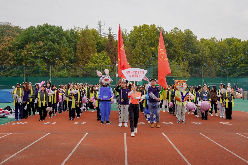 随着《凯旋进行曲》响起,运动会入场式正式开始。动科动医学院代表方阵身着动物玩偶服、动物发箍,手持动物气球、“DKDY”字母牌,高喊“发扬体育精神,增强师生体质,动科动医,勇创第一”的口号,快步走过观礼台。