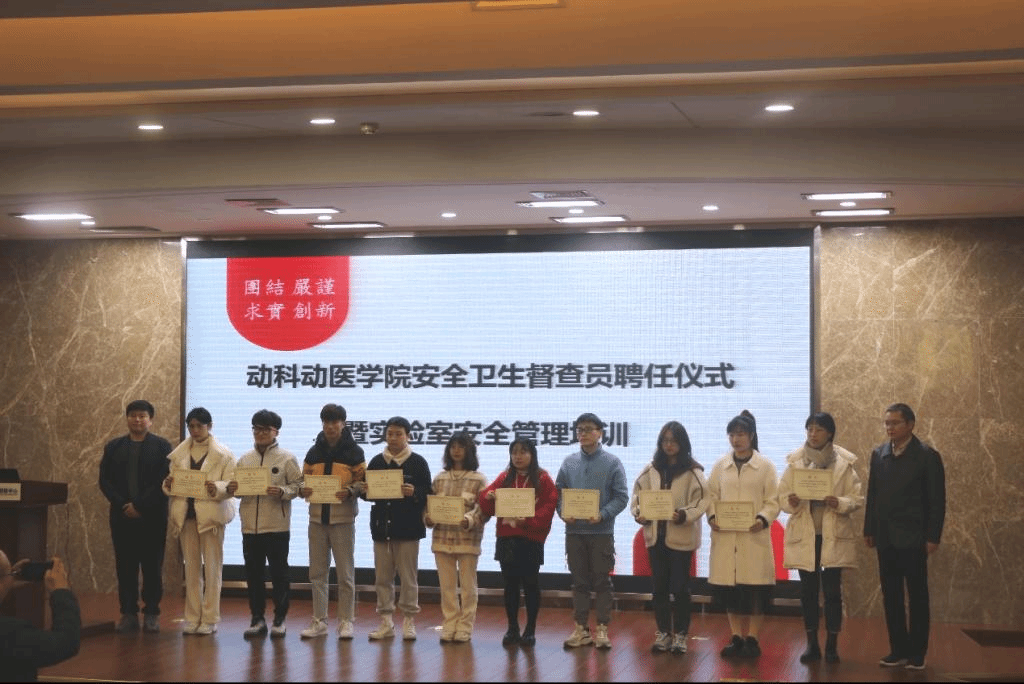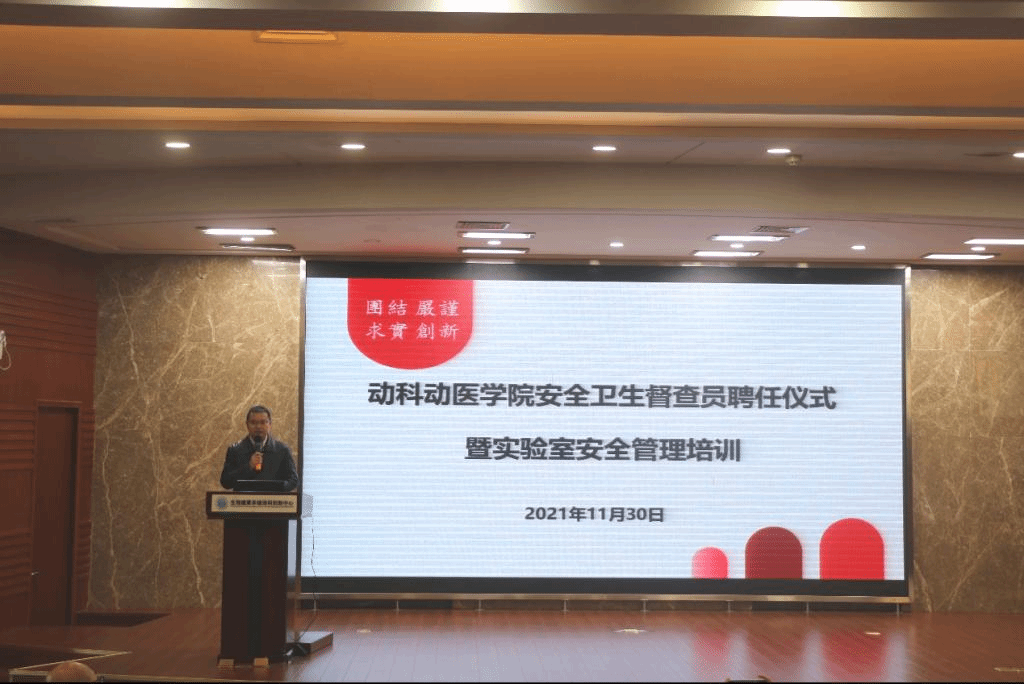 (通讯员 周萍)11月30日下午,学院在生猪健康养殖协同创新中心一楼报告厅举办2021-2022年度安全卫生督查员聘任仪式暨实验室安全管理培训。学院副院长胡丽华、校园建设与安全保卫部安全管理办公室黄远卓及本学年拟聘任的安全卫生督查员、各实验室安全责任人、科研助理、危化品管理人员等近百人参与本次活动。活动由学院研究生辅导员陈泊宁主持。