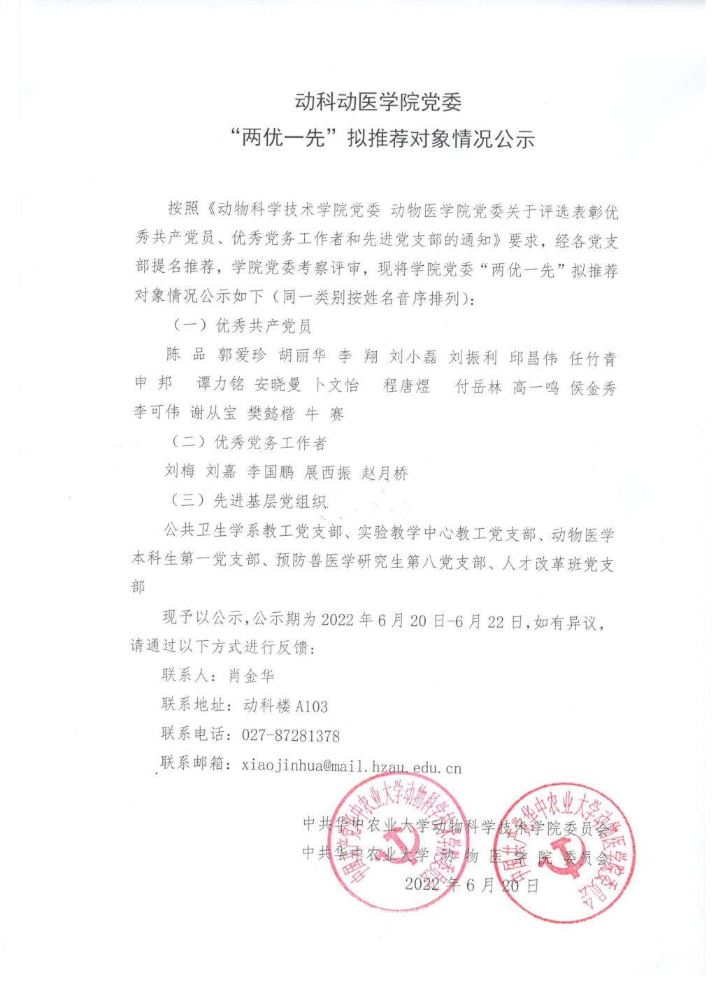 动科动医学院党委“两优一先”拟推荐对象情况公示