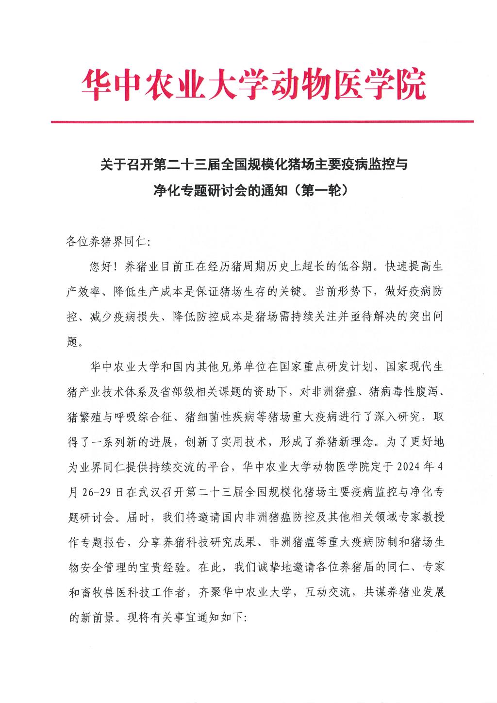 关于召开第二十三届全国规模化猪场主要疫病监控与 净化专题研讨会的通知(第一轮)