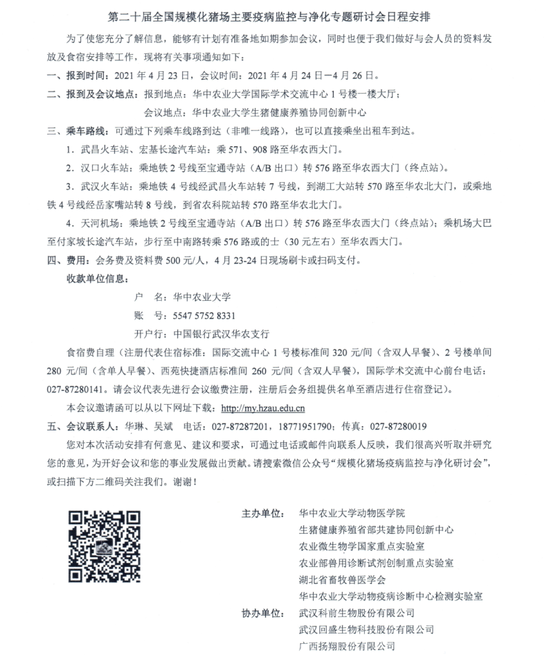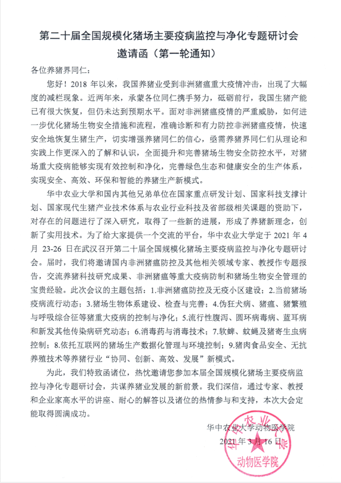 第二十届全国规模化猪场主要疫病监控与净化专题研讨会邀请函(第一轮通知)