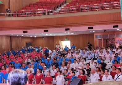 刚到大学生活动中心,就看到离退休教职工正在充满激情的组织拍照,完美的诠释了青春是一种心态,而不止于年龄。抒发爱国情怀、歌唱美好时代的最佳方式就是合唱,红歌大合唱演出开始,一首又一首耳熟能详的歌曲唱出了浓浓的家国情怀。