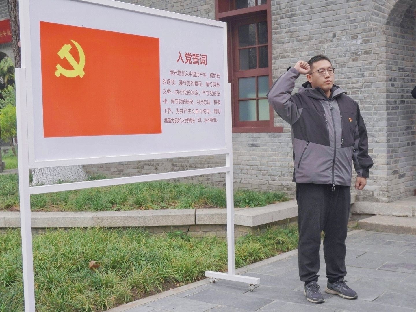 在中共五大会址纪念馆的党旗下,动科动医学院各党支部预备期满一年的预备党员进行转正宣誓大会。会上,全体拟转正党员在陈炳宇的带领下庄严宣誓,表达对党的忠诚、对人民的担当。