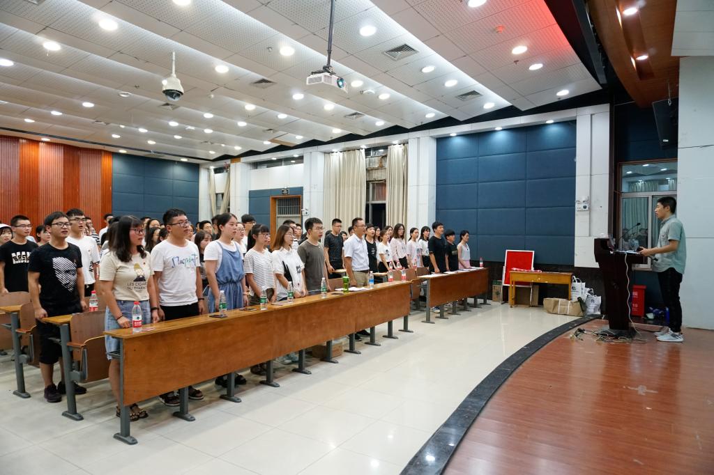 完成首项仪程奏唱国歌后,刘兴斌上台为10名新发展党员佩戴党徽。随后,党员领誓人刘旭鹏带领全场党员宣读入党誓词。