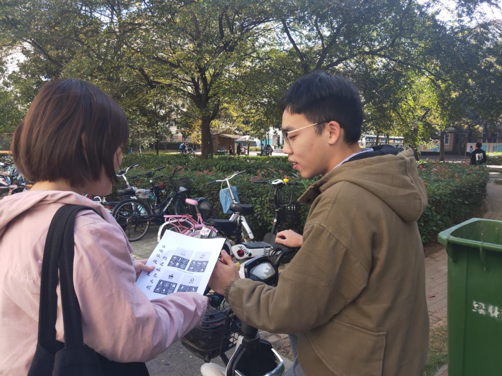 活动当日,党支部成员在垃圾桶上张贴垃圾分类的宣传标语,指引同学们分类扔垃圾。其次,党员同志们向路过的同学科普垃圾分类的必要性,并调查其对垃圾分类的了解情况。此外,同志们还亲自到在南湖旁清洁垃圾,亲身体验不乱扔垃圾、扔对垃圾的必要性。