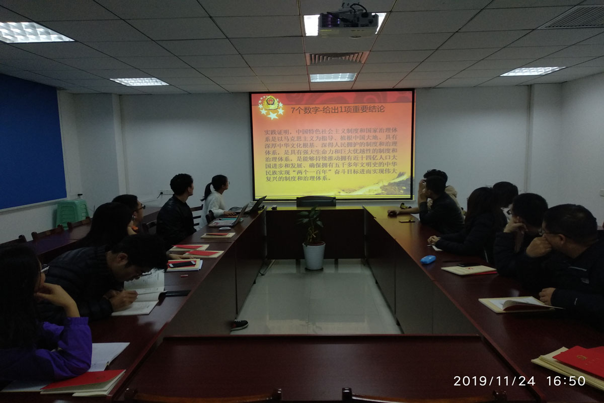 之后,支部书记王晨晨带领大家全面的学习党的十九届四中全会精神,主要内容概括为“7个数字 9个提法”。7个数字主要包括通过1份重要文件、做出1个重要判断、给出1项重要结论、强调13个方面的“显著优势”、提出1个“总体目标”、明确13个“坚持和完善”、公布2项人事信息等;9个提法主要包括国家治理效能、建立不忘初心、牢记使命的制度、健全人民文化权益保障制度、构建服务全民终身学习的教育体系、建立解决相对贫困的长效机制、社会治理共同体、完善正确处理新形势下人民内部矛盾有效机制、全面建立资源高效利用制度、建立健全特别行政区等提法。