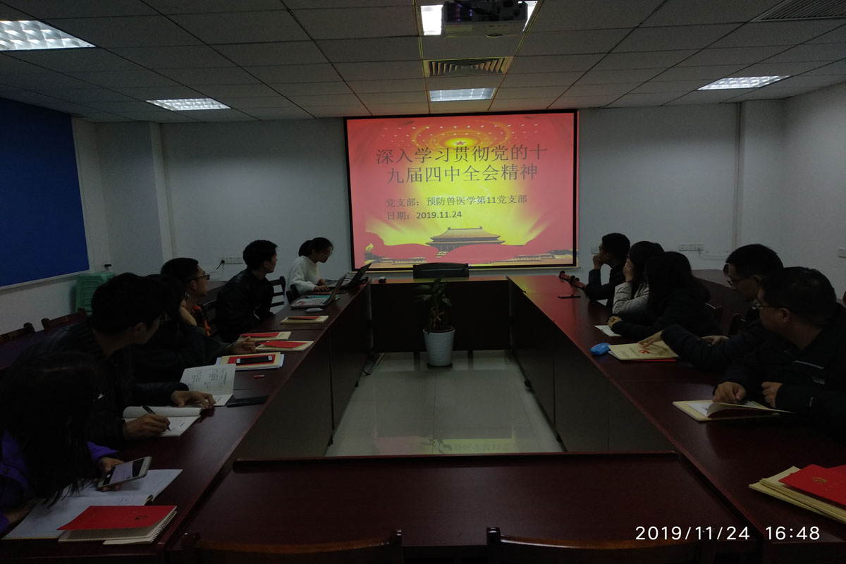 (动科动医学院通讯员 段本振 杨凤鸣 供图 段本振)为加强党性修养、提升思想觉悟、深入学习党的精神,11月24日下午16:40,中共华中农业大学动科动医学院预防兽医学研究生第十一支部于生猪健康养殖协同创新中心214会议室召开“深入学习贯彻党的十九届四中全会精神”全体党员大会,出席本次活动的有支部全体党员同志及部分入党积极分子。