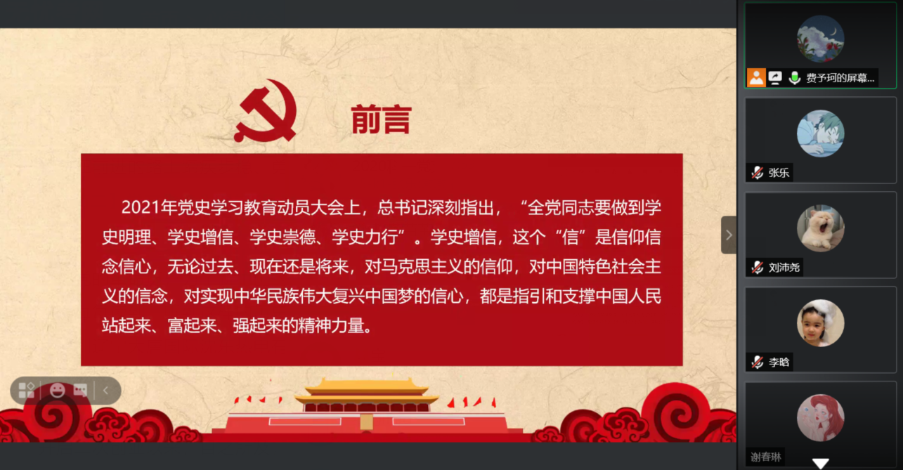 首先,费予珂同志向大家介绍了本次学习的主要内容。2021年党史学习教育动员大会上,总书记深刻指出,“全党同志要做到学史明理、学史增信、学史崇德、学史力行”。学史增信,这个“信”是指信仰、信念、信心,无论在过去、现在还是将来,对马克思主义的信仰,对中国特色社会主义的信念,对实现中华民族伟大复兴中国梦的信心,都是指引和支撑中国人民站起来、富起来、强起来的精神力量。李亚梅同志强调,在学习党史的过程中,我们要把新民主主义革命时期历史、社会主义革命和建设时期历史、改革开放新时期历史、党的十八大以来的历史贯通起来,深刻认识到这是一部伟大的奋斗史,才使得在几千年的历史流变中,中华民族能够一直立于世界之林。