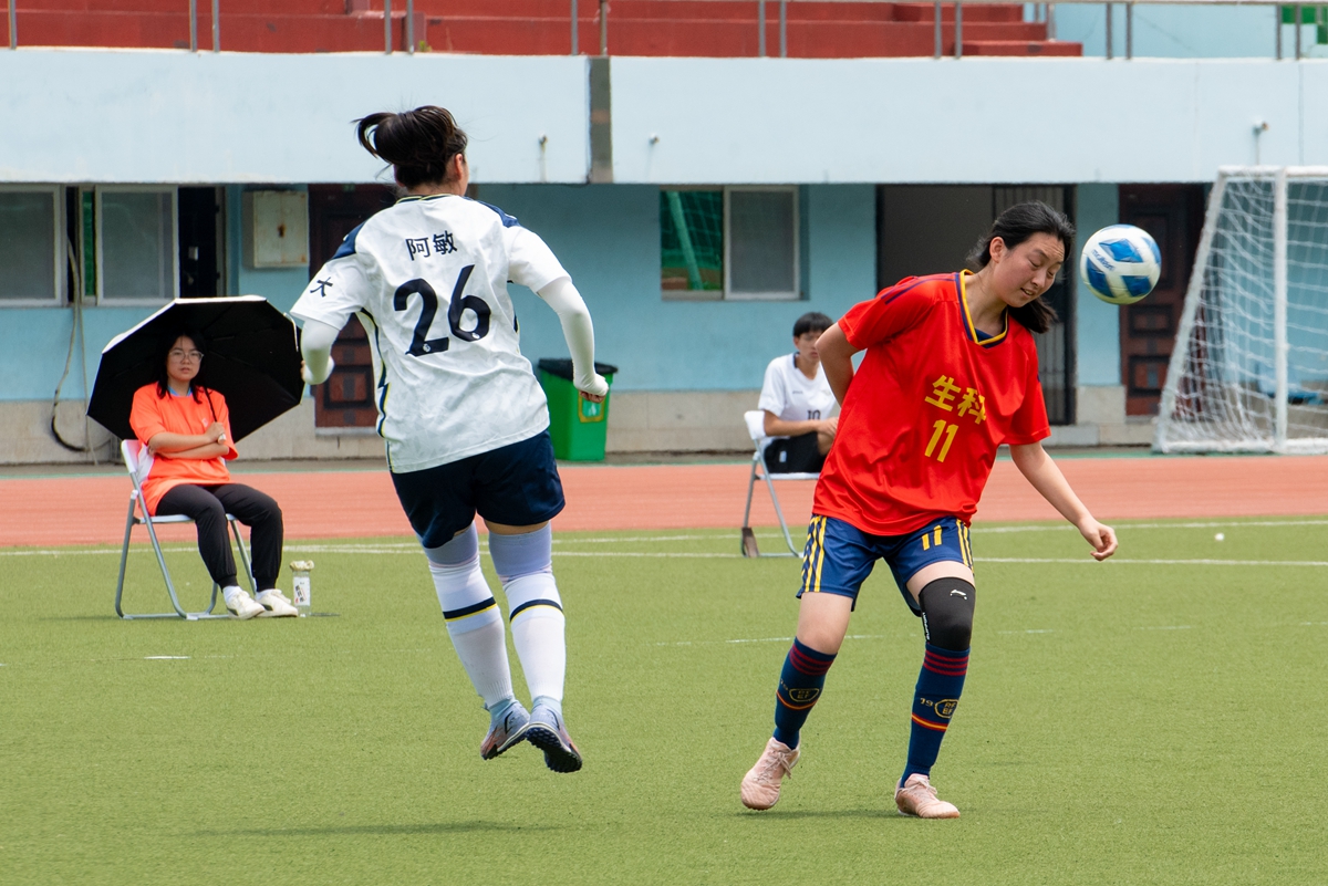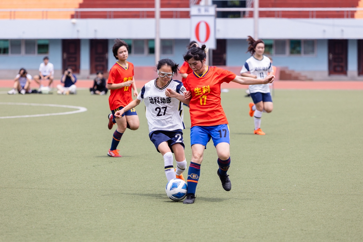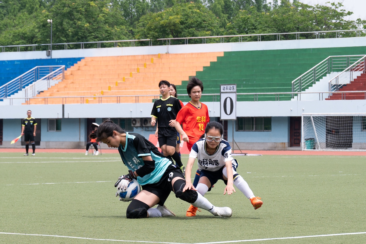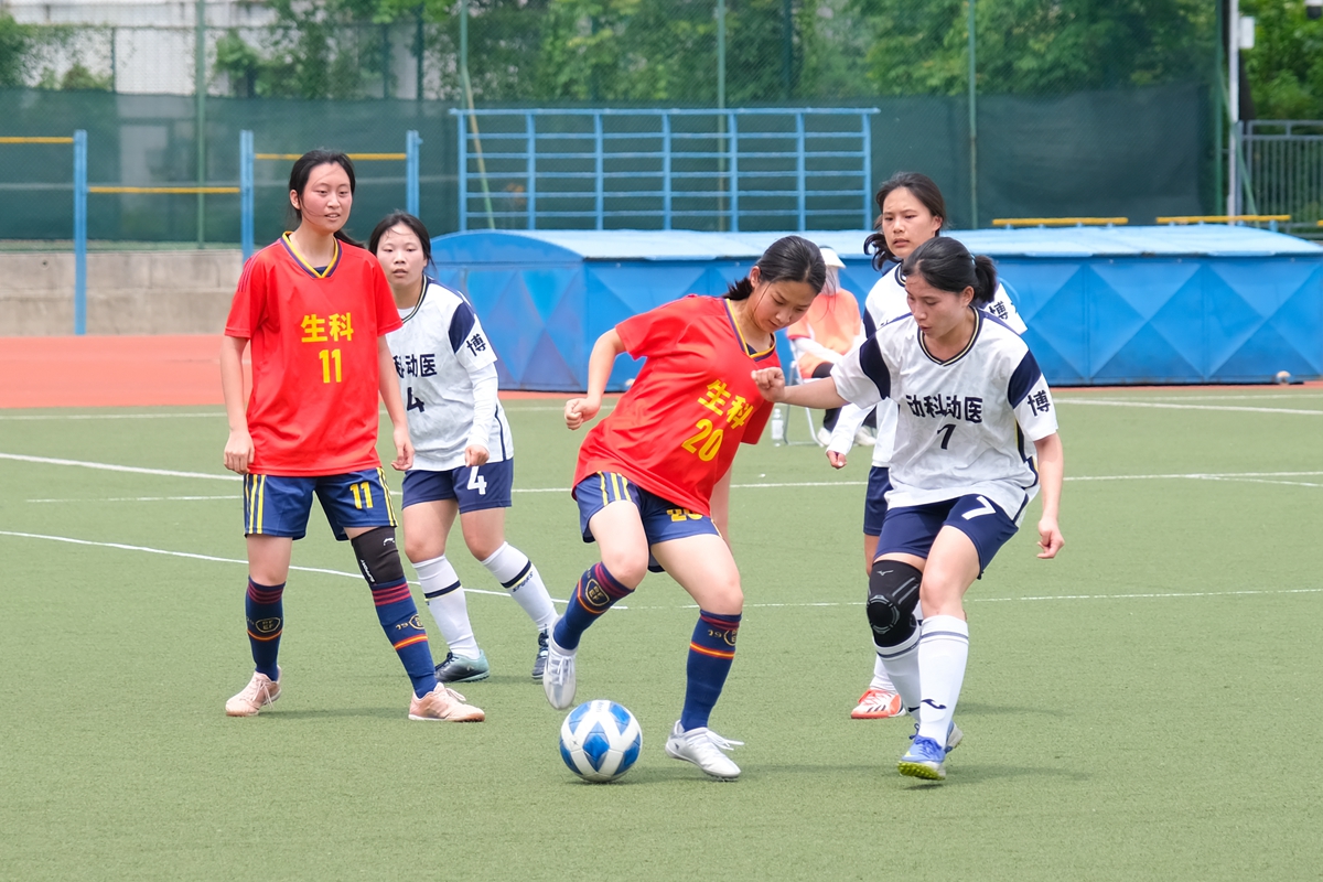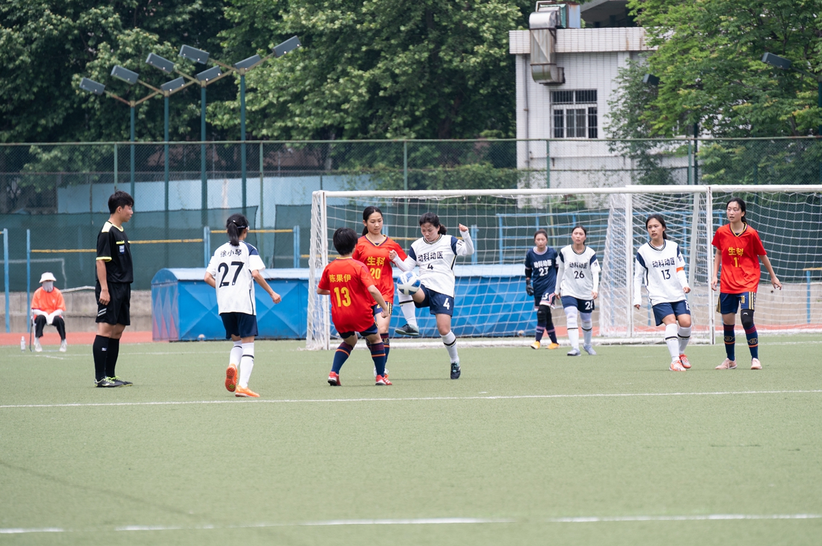 随着主裁判的一声哨响,比赛开始。开局阶段,动科动医学院攻势猛烈,频频在生科学院禁区内造成“险情”,奈何生科学院防守严密,未让动科动医学院“得逞”。第12分钟,动科动医学院门将23号吕英琪后场发球失误,生科学院17号李若楠拦截成功,觅得射门良机,但在对方27号徐小琴的高压逼抢下失去球权。第18分钟,动科动医学院7号刘茜夺得球权,摆脱防守,起脚抽射,对方门将将球“没收”。