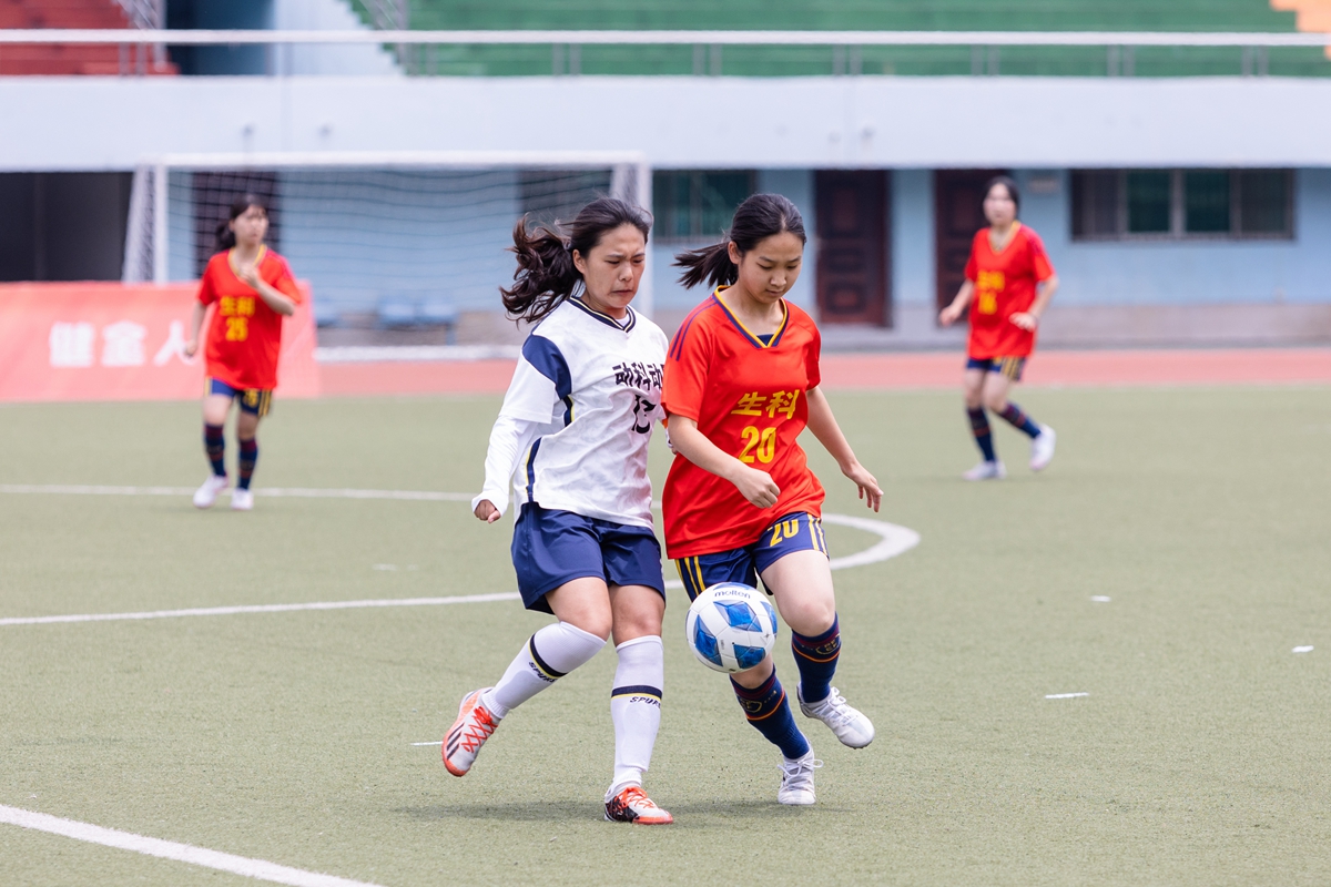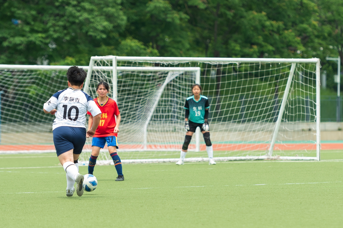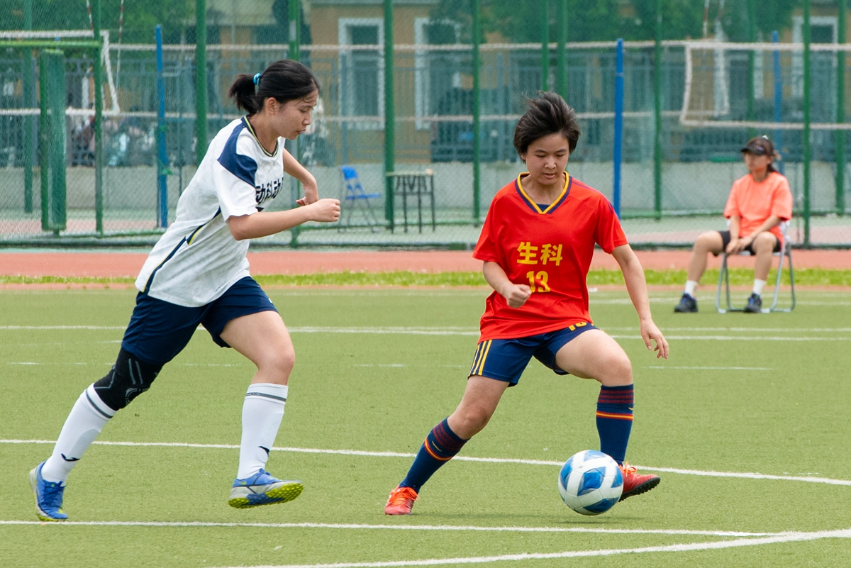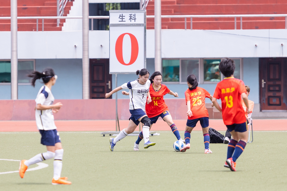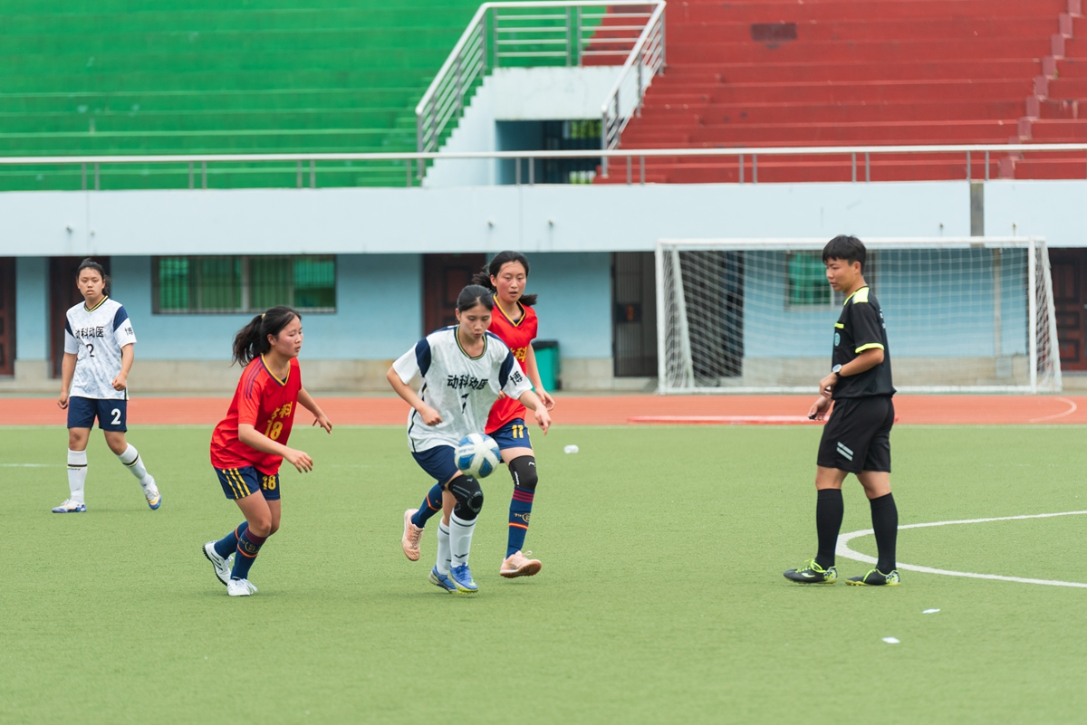 随着主裁判的一声哨响,比赛开始。开局阶段,动科动医学院攻势猛烈,频频在生科学院禁区内造成“险情”,奈何生科学院防守严密,未让动科动医学院“得逞”。第12分钟,动科动医学院门将23号吕英琪后场发球失误,生科学院17号李若楠拦截成功,觅得射门良机,但在对方27号徐小琴的高压逼抢下失去球权。第18分钟,动科动医学院7号刘茜夺得球权,摆脱防守,起脚抽射,对方门将将球“没收”。