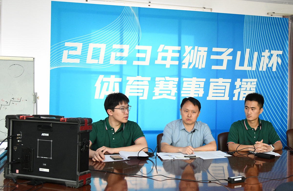 罗晓峰老师和鲁克嵩同学(右一)、曹孟一同学正在作直播解说(记者 徐行 摄)