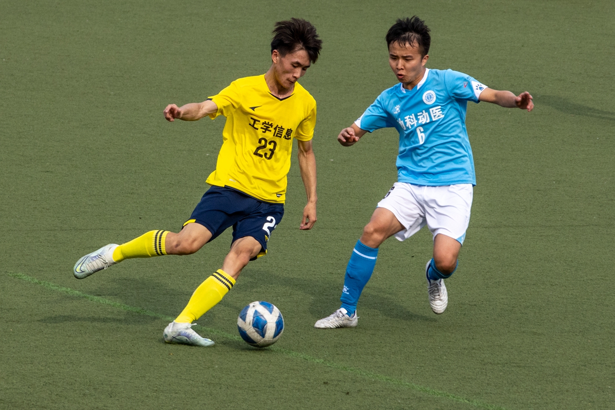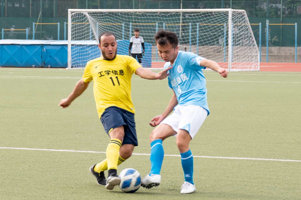 互不相让(图为动科动医学院20号匡磊与工信联队25号莫泓滔中场激烈拼抢)(学通社记者 王子仪 摄)