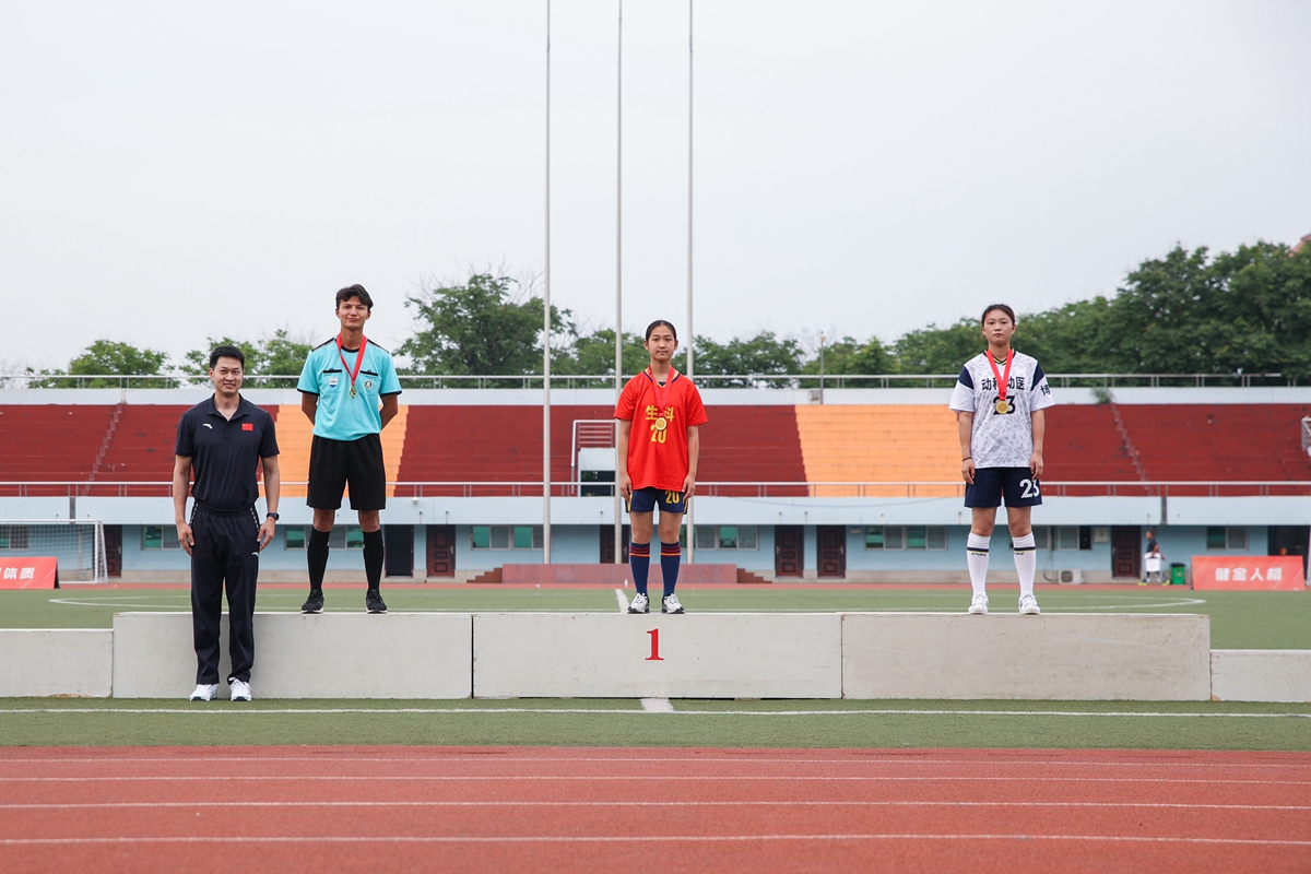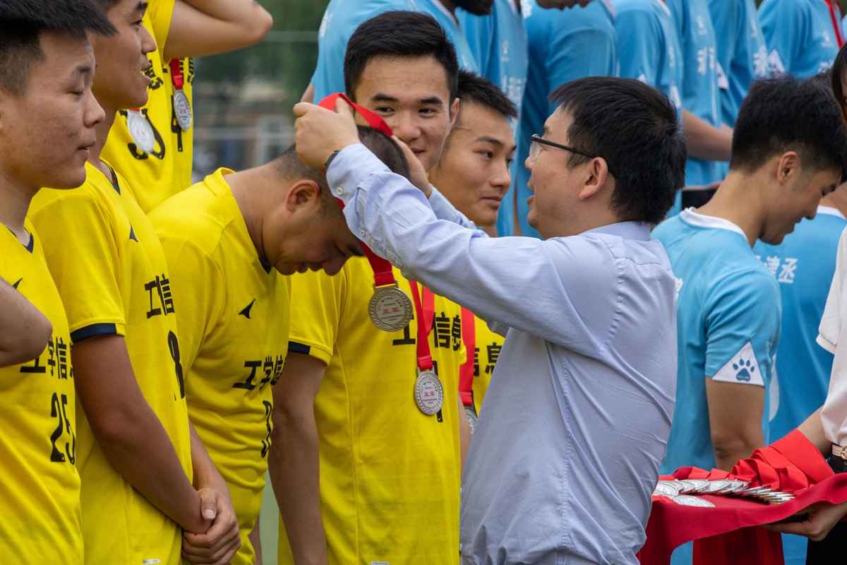 失球后的工信联队开始急躁,后场频频失误,但动科动医学院也未把握机会扩大比分。补时第2分钟,工信联队获得将比赛拖入点球大战的机会,9号肖畅宇禁区前接队友传球后劲射被挡,7号Habeeb顺势补射,只见足球朝着对方球门右上角而去,正当大家以为球进时,动科动医学院1号门将王禹翔跃起,上演极限救险,在门线上将球奋力扑出,“绝平”奇迹没有发生。随着终场哨响,工信联队扳平的希望被彻底“浇灭”,比分定格在了2:1,动科动医学院逆转夺得冠军,工信联队获得亚军。