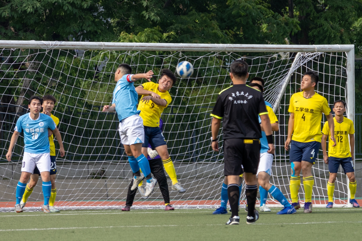 随着主裁判一声哨响,比赛开始。开局阶段,双方相互试探,在中场谨慎组织传导,一时很难进入对方的腹地。随着比赛深入,动科动医学院在中场核心19号雷铭楷的有效组织下,攻势渐起,先发制人,工信联队1号门将沈威高接低挡,成为场上最“忙碌”人。