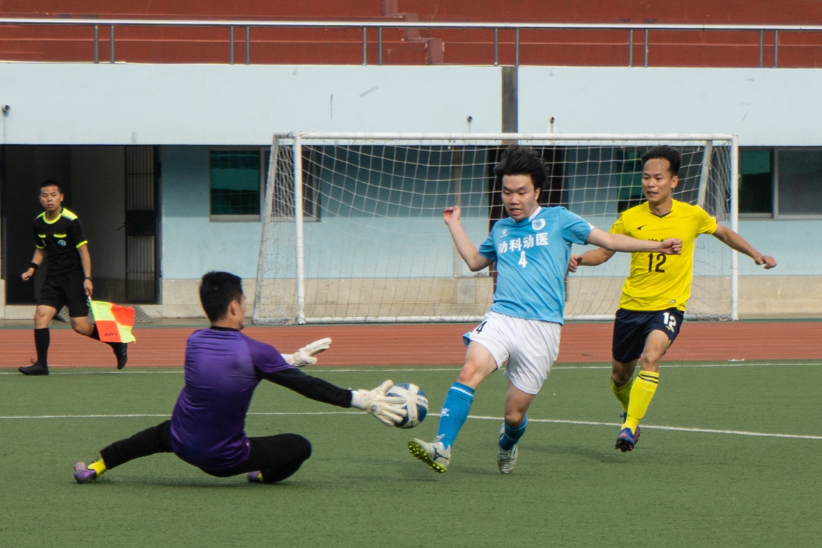 第30分钟,动科动医学院4号王定一面对出击门将,晃过后冷静射门 (学通社记者 杨宇婧 摄)