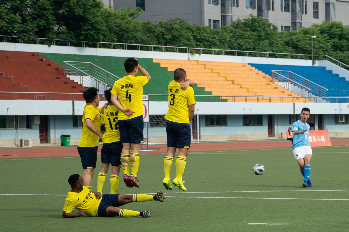 易边再战,下半场刚开始,工信联队再获位置绝佳任意球机会,还是7号Habeeb站在球前,可惜力量稍大,擦着球门横梁飞出,惊出对方一身冷汗。动科动医学院则加快节奏,不断从两翼发起进攻。随着比赛推移,工信联队队员体力下降,开始动作变形,连续因侵犯对方获得黄牌,动科动医学院则趁势反击,工信联队1号门将沈威不得不多次化解对方射门,力保城门不失。