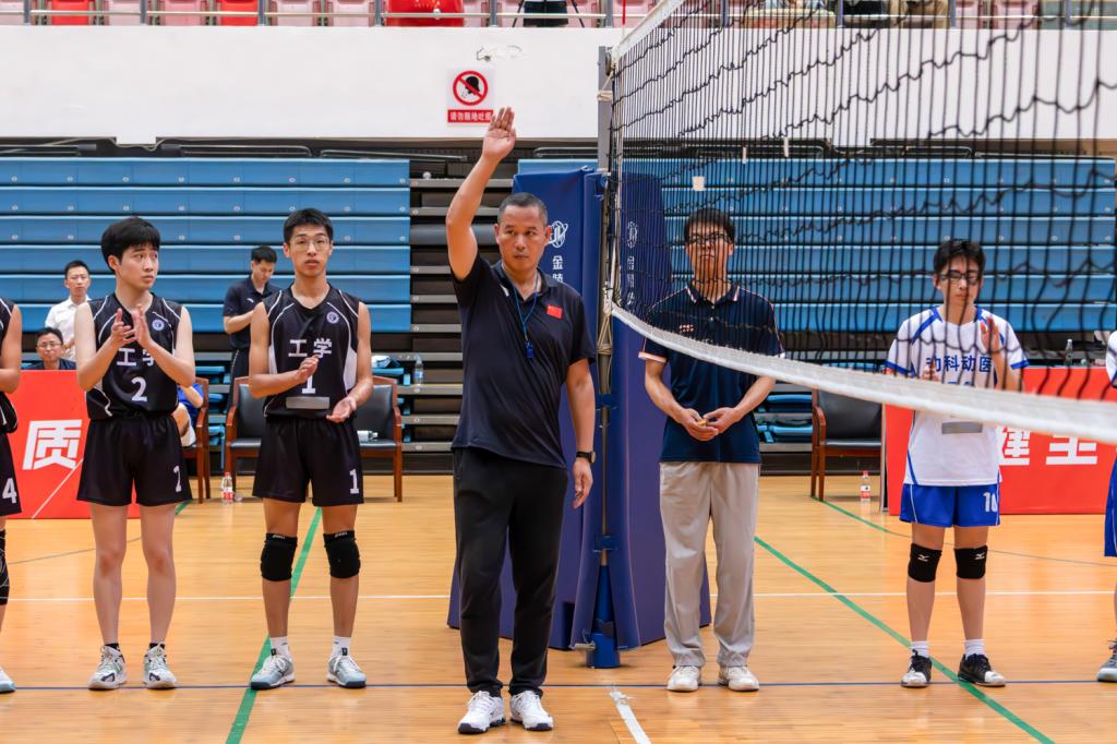 第一局,动科动医男排开球,动科动医队接球触网,工学院队先得1分。随后动科动医男排也不甘示弱,5号张泽宇找准时机,大力跳发、飞身扣球,工学院球员未能及时接球,双方比分追平。随后,经过一段胶着的比拼,工学院8号赵永坤多次起跳暴扣,比赛比分拉大。双方你追我干,比分来到24:22。工学院队员列好队形、严阵以待,4号柯锐栋瞄准对手空缺挥臂扣球,动科动医5号张泽宇反应敏捷,接下对手一记暴扣后果断侧向传球给队友,3号姜政迅速扑地鱼跃救球并击球过网,工学院9号廖彼得则趁机拦网,动科动医19号周国强传球未过网,工学院以25:22拿下一局。