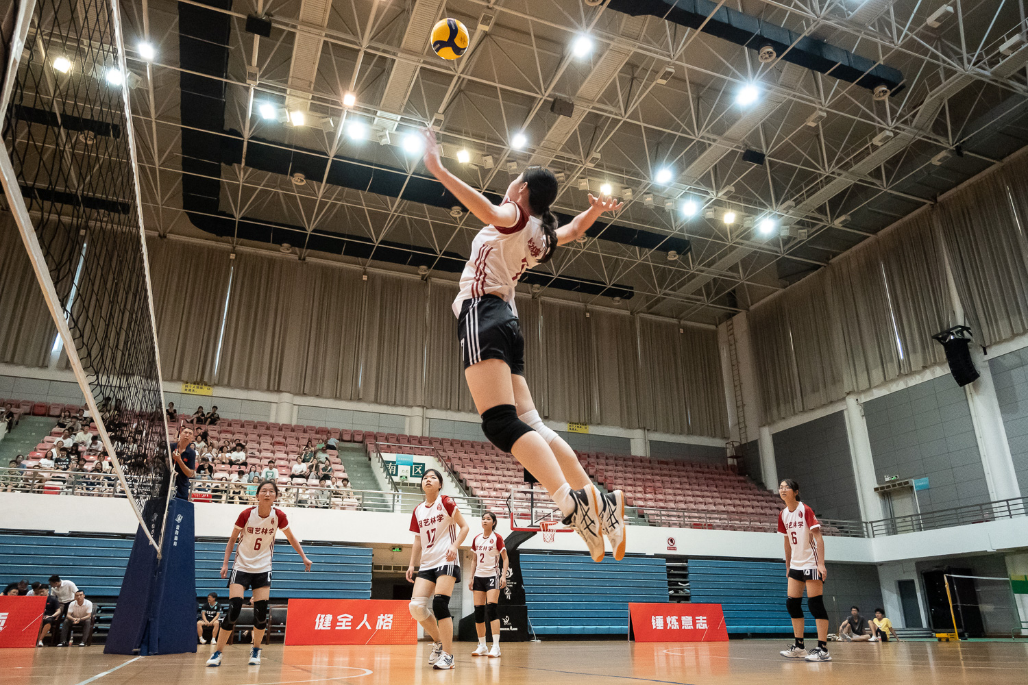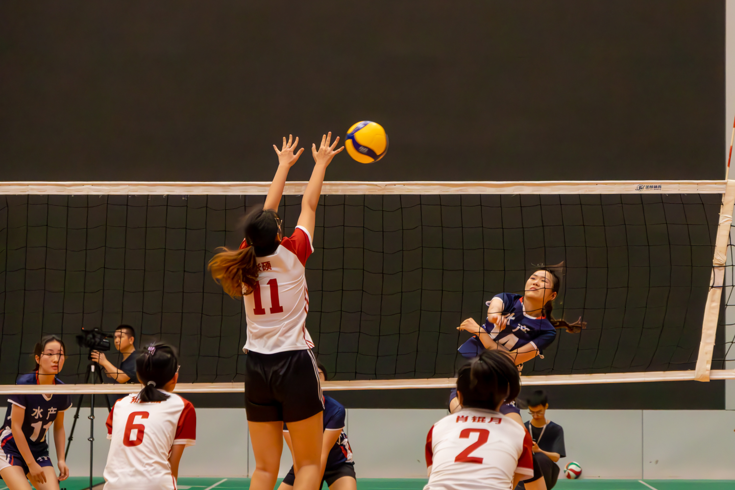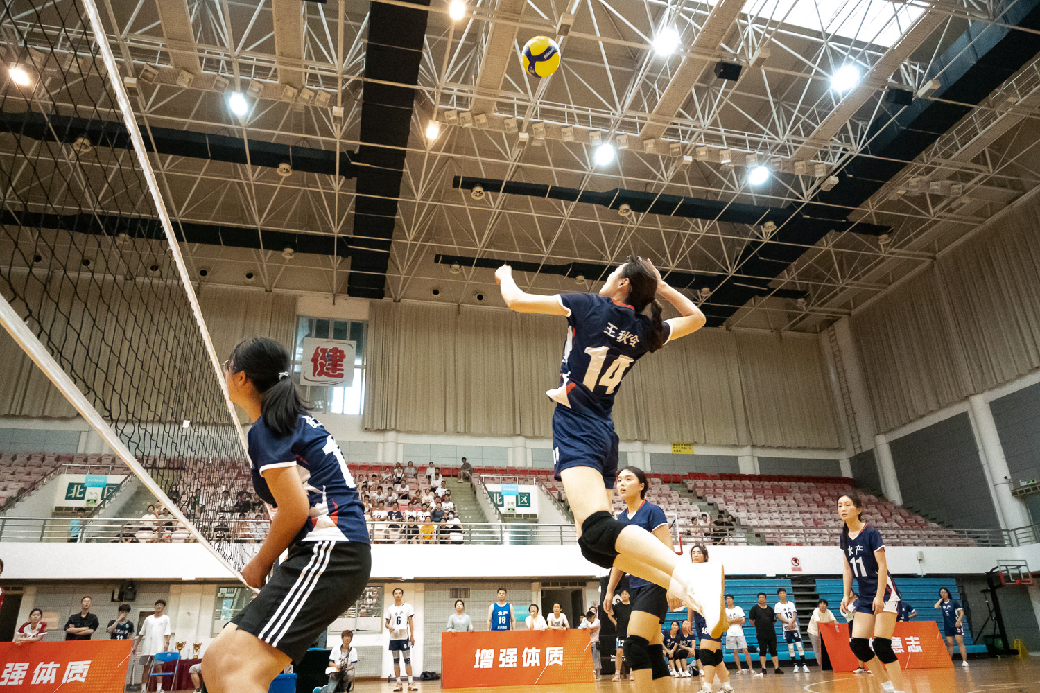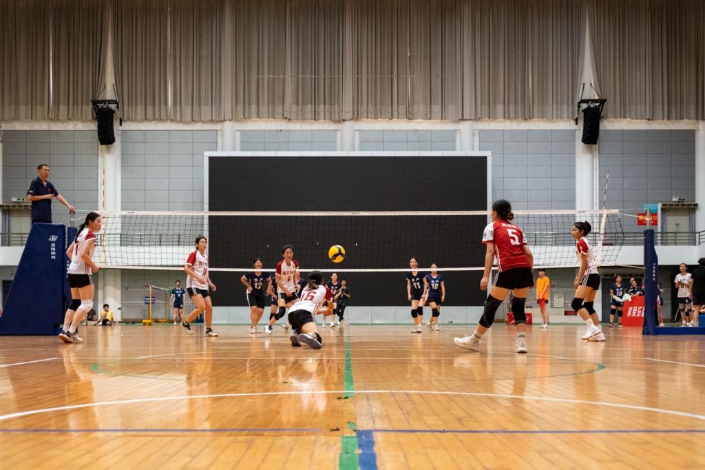 在率先举行的女排决赛中,参赛的两支队伍分别是园艺林学学院女排和水产学院女排。