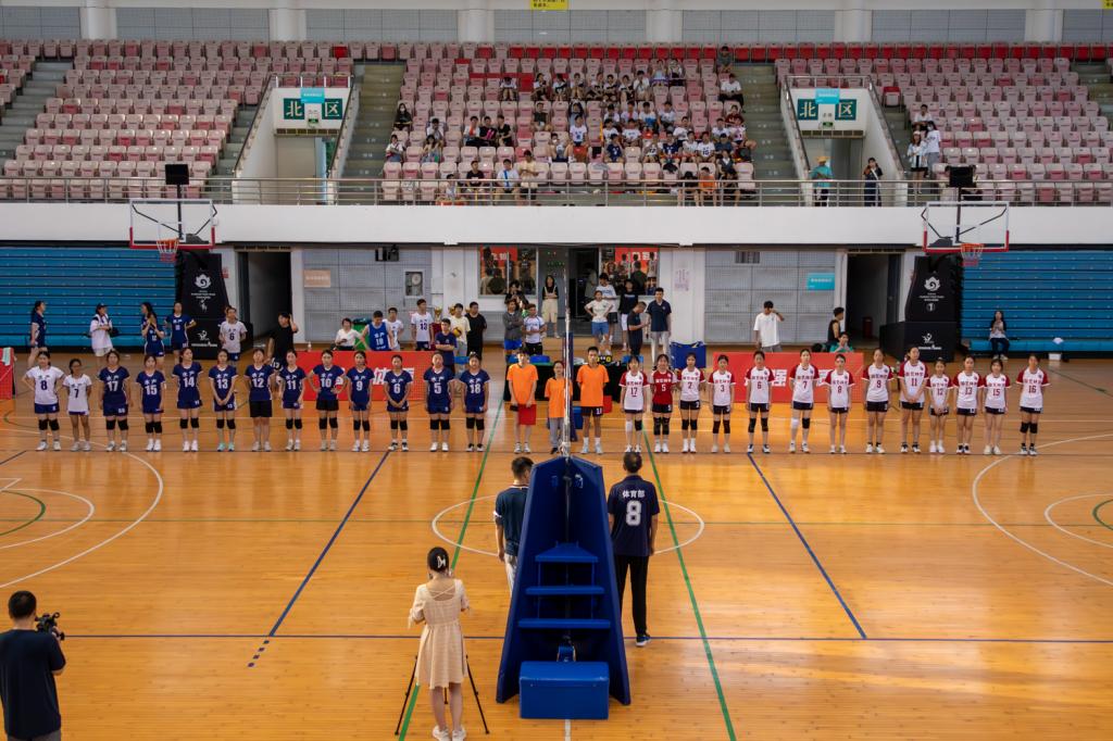 比赛尚未开始,参赛队员早已抵达场地开始热身训练,此起彼伏的传球声伴随着欢快的暖场音乐,在运动馆内回响。观众席热闹非凡,啦啦队击鼓呐喊,为支持的球队助威。工作人员、裁判员也在做最后的赛前准备。